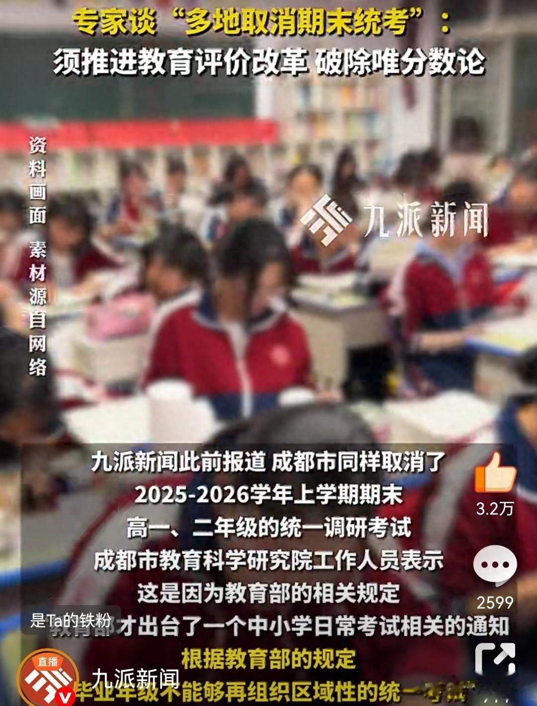 01 政策落地全国多地的教育部门几乎同时调整了考试安排。成都率先发布通知,明确取消2025-2026学年度上学期高一、高二期末统一调研考试。