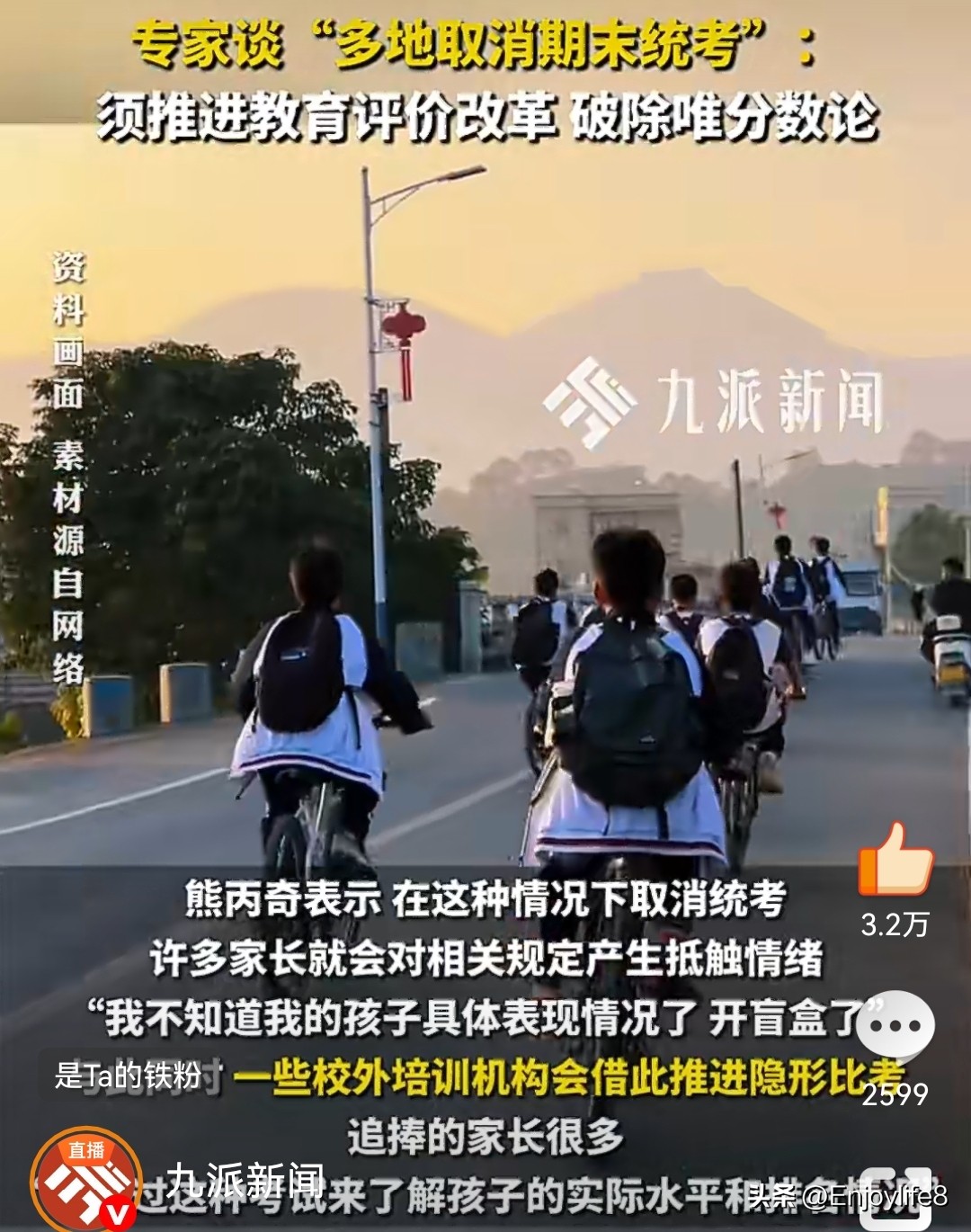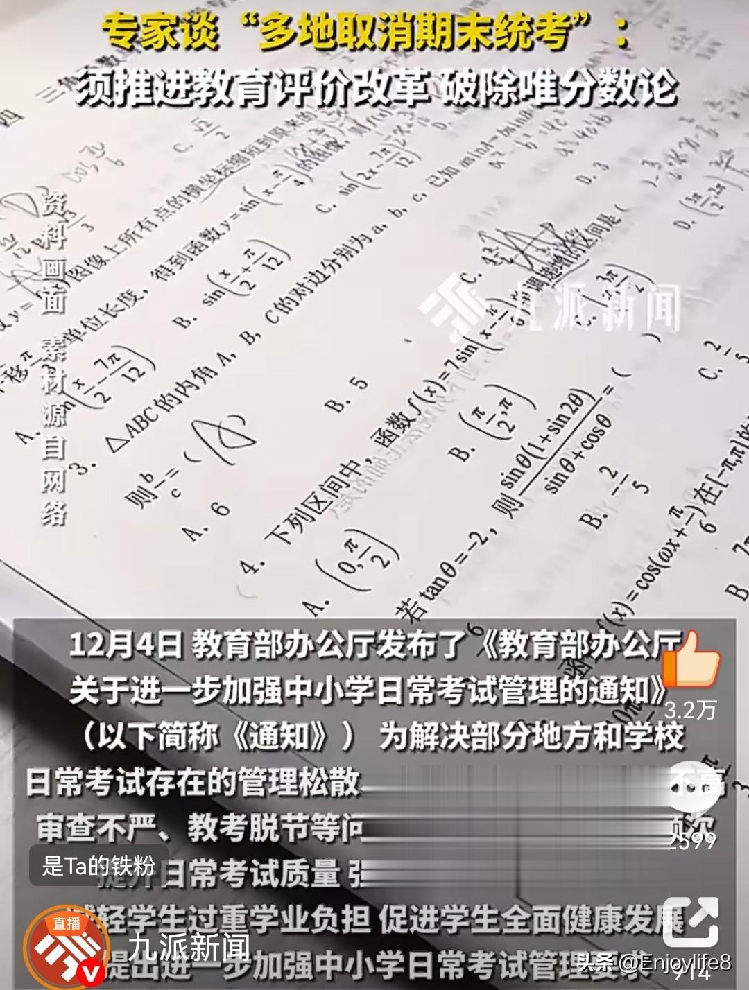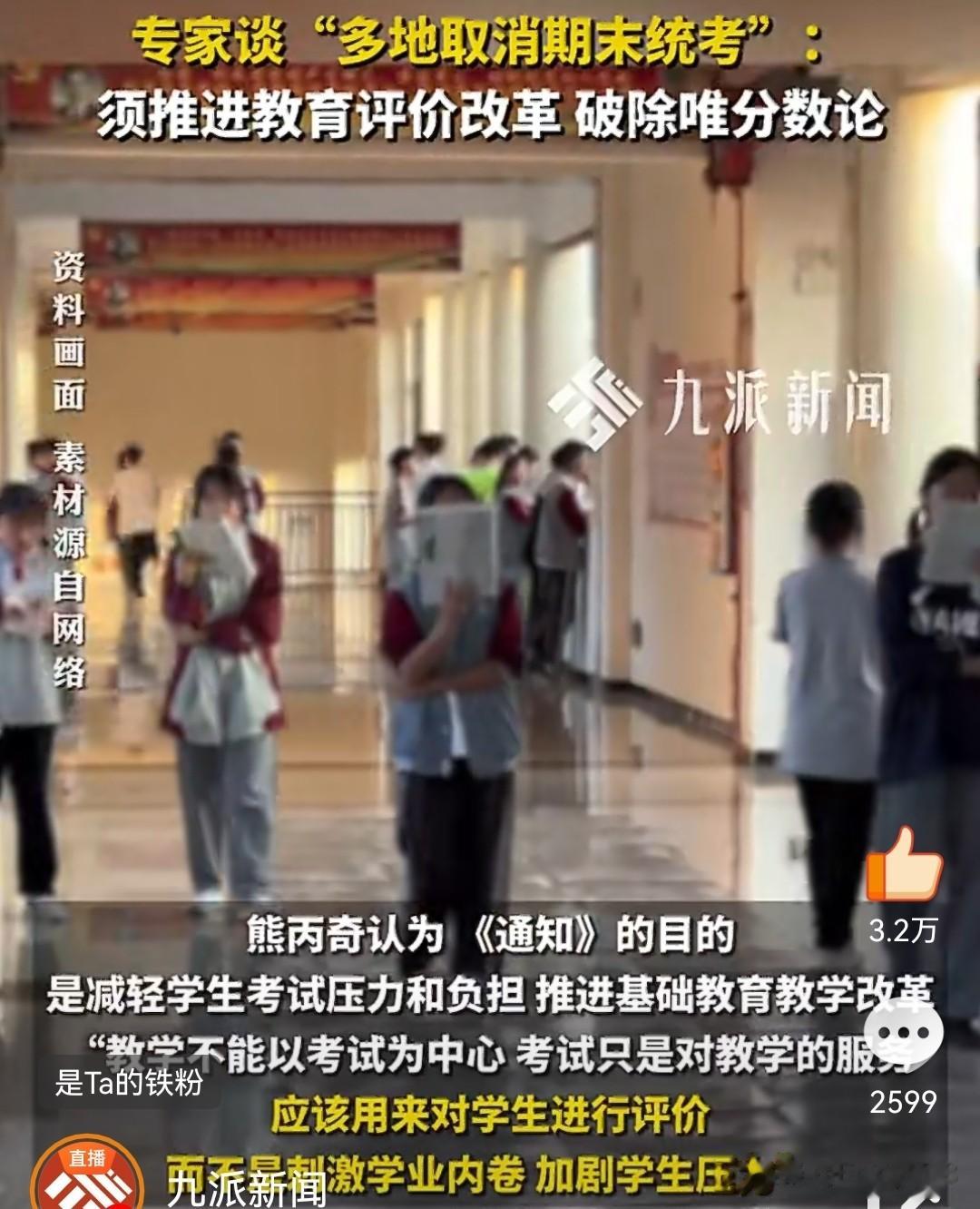 1. 九派新闻:《专家谈多地取消期末统考:须推进教育评价改革,破除唯分数论》