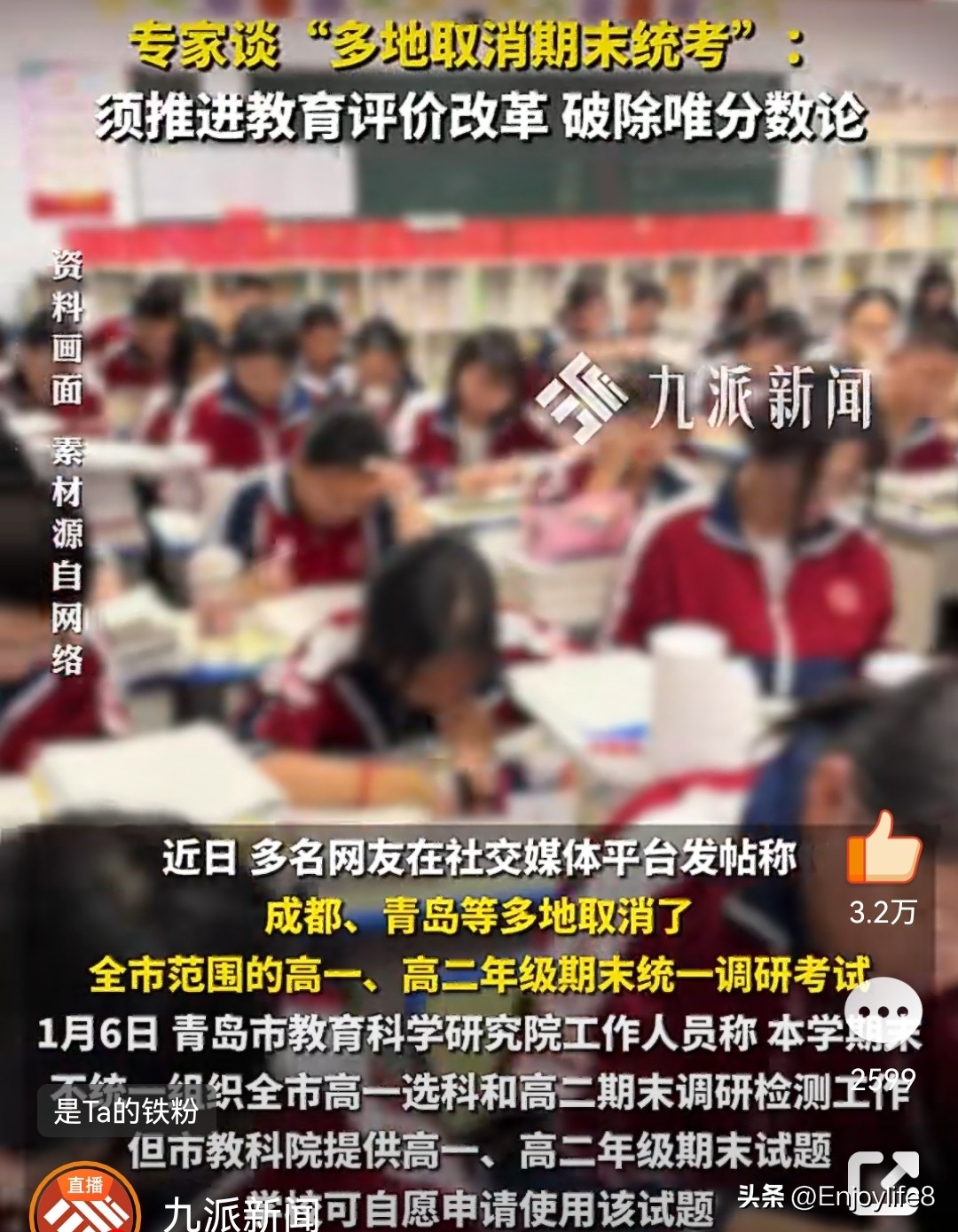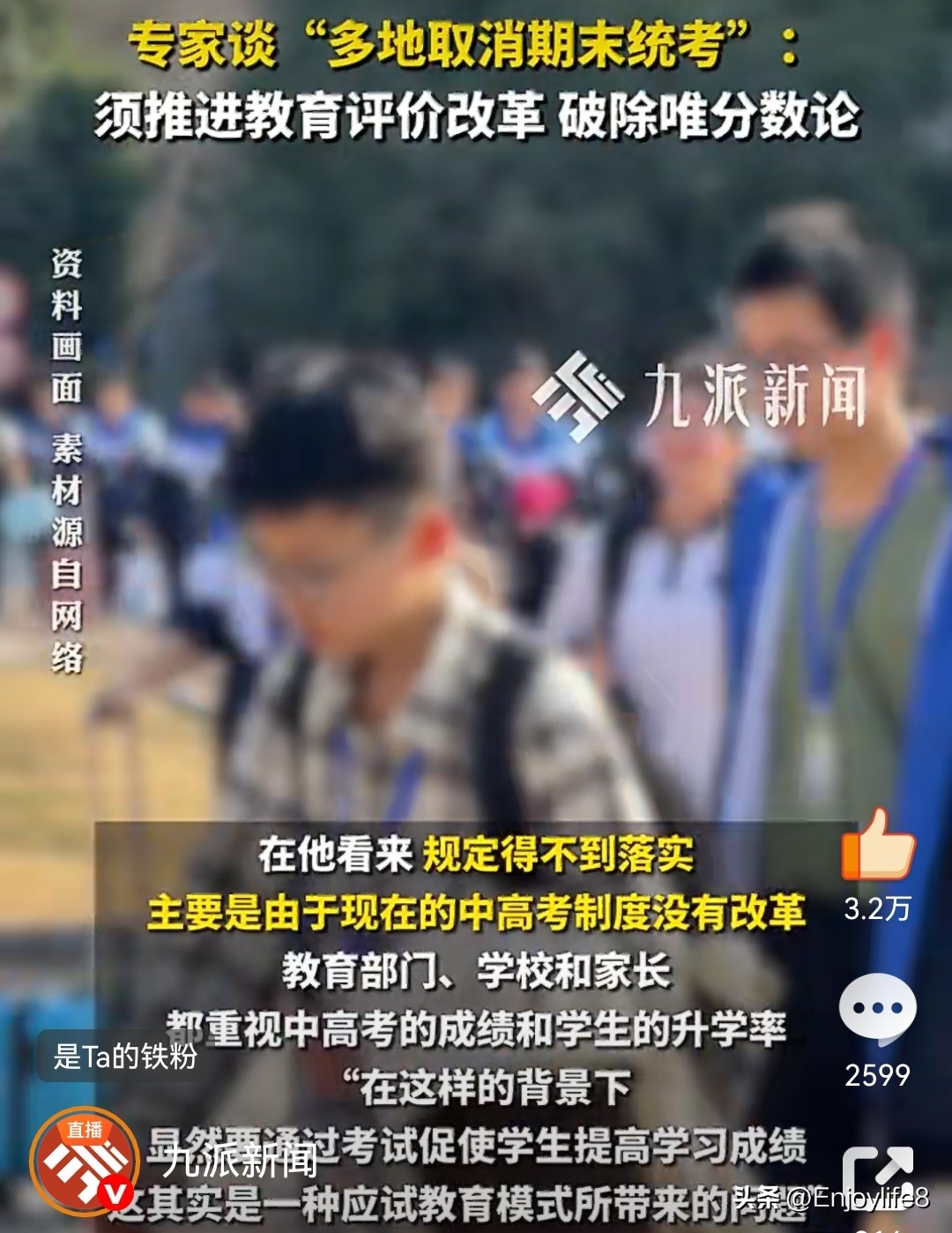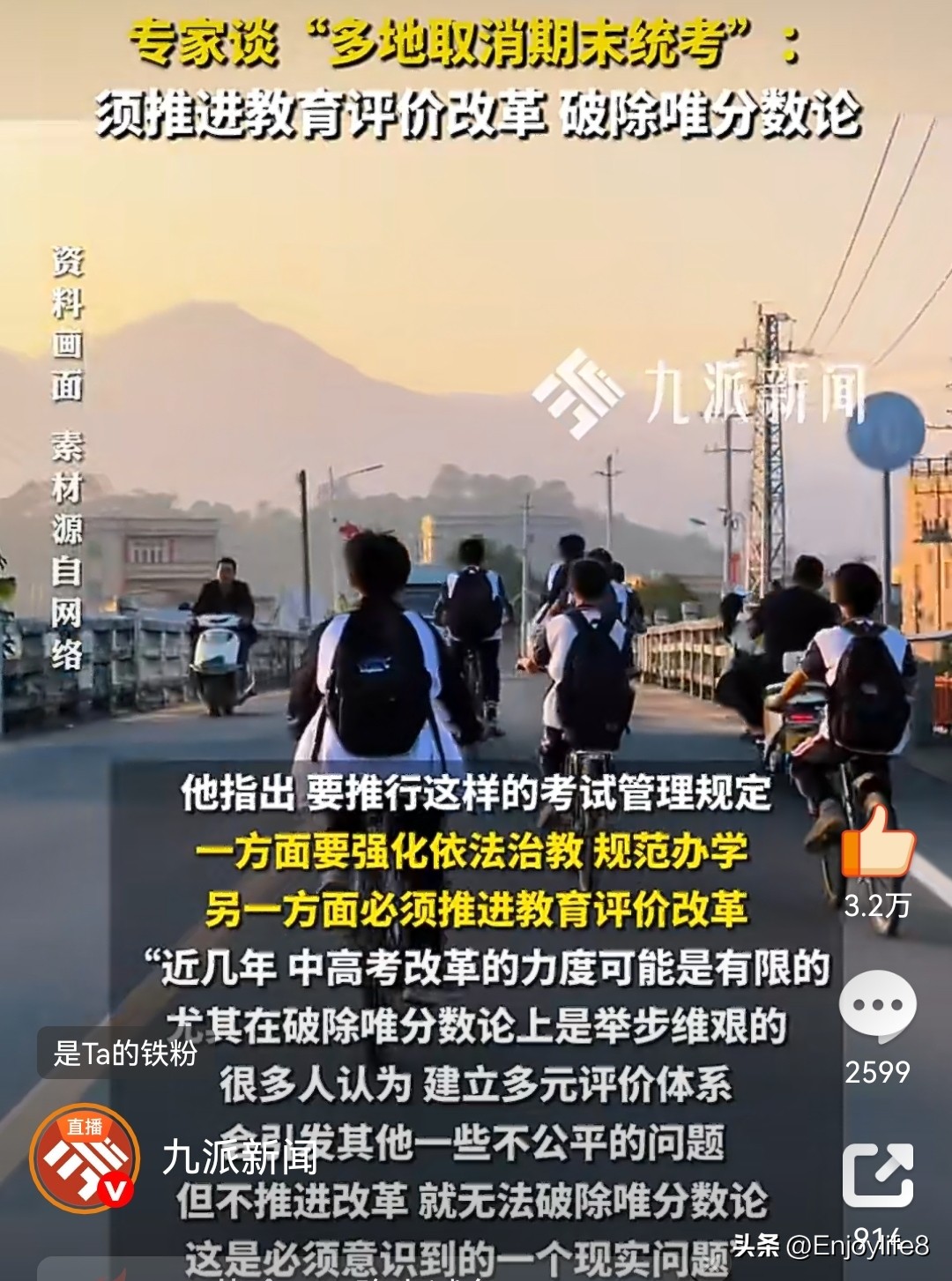 1. 九派新闻:《专家谈多地取消期末统考:须推进教育评价改革,破除唯分数论》