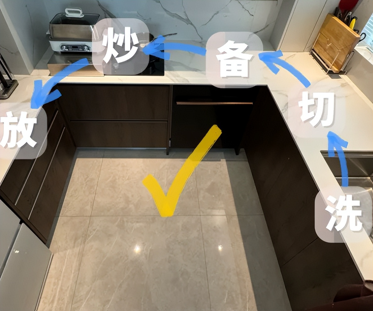 厨房的布局按照这冰箱、水槽、切菜、灶台、摆盘这样设计,动线不乱,能减少时间和j家务。