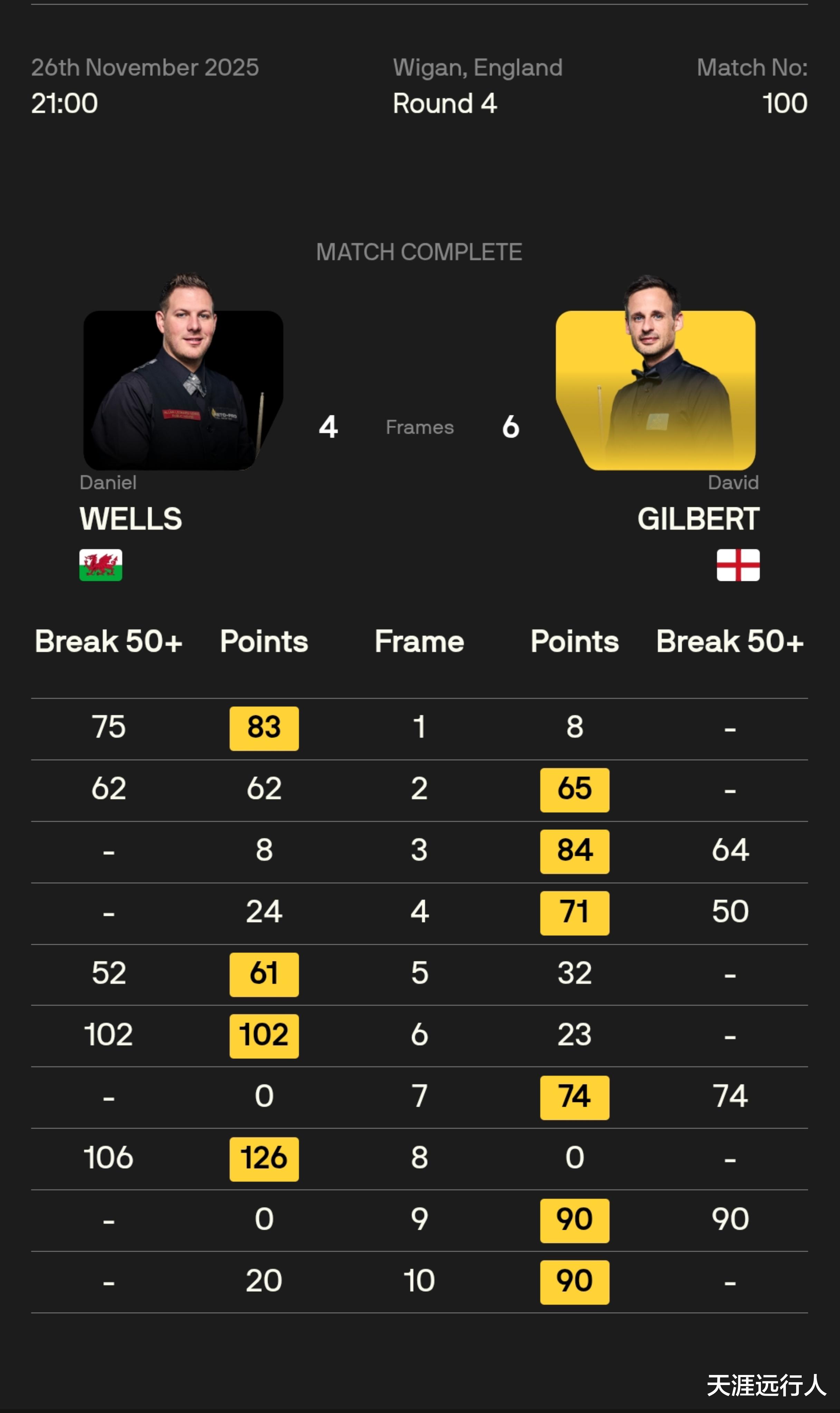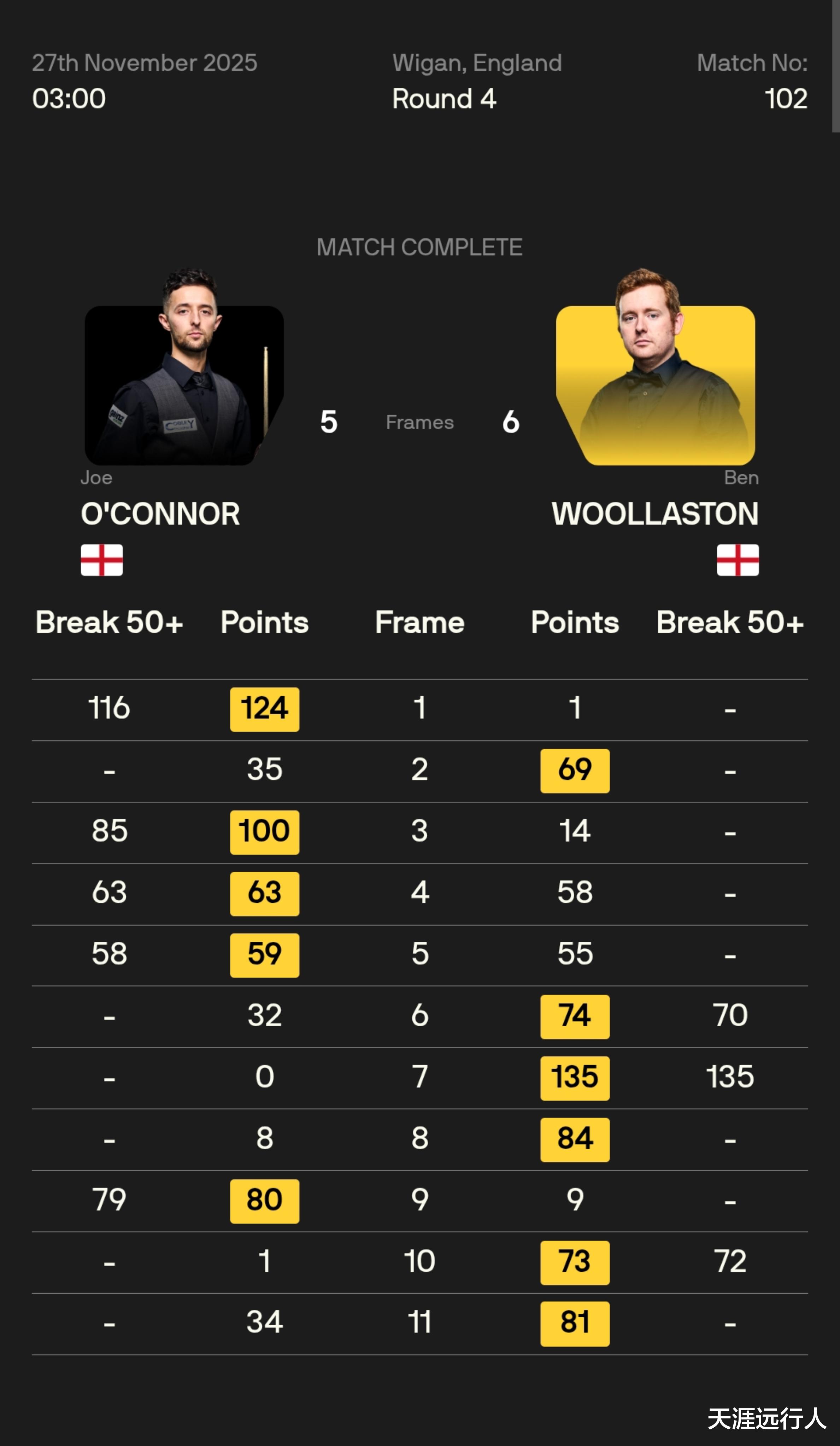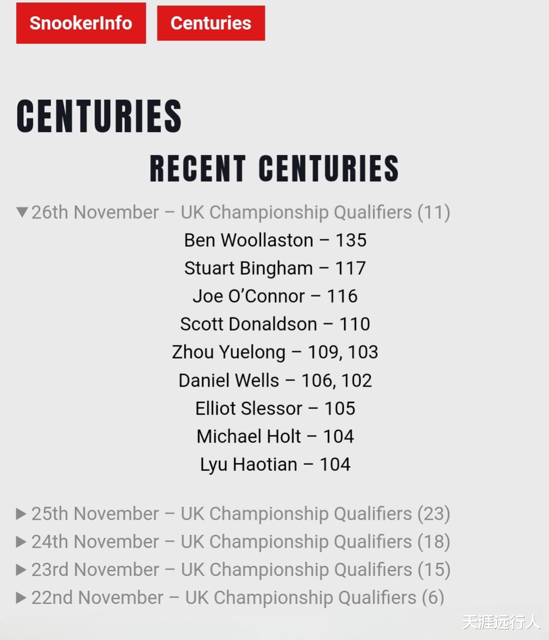 这个比赛日共打出11杆单杆过百,中国球员贡献三杆,出局的丹尼尔·威尔斯、宾汉姆、奥康纳打出来四杆“哑炮”,本届英锦赛的破百杆数来到73杆。