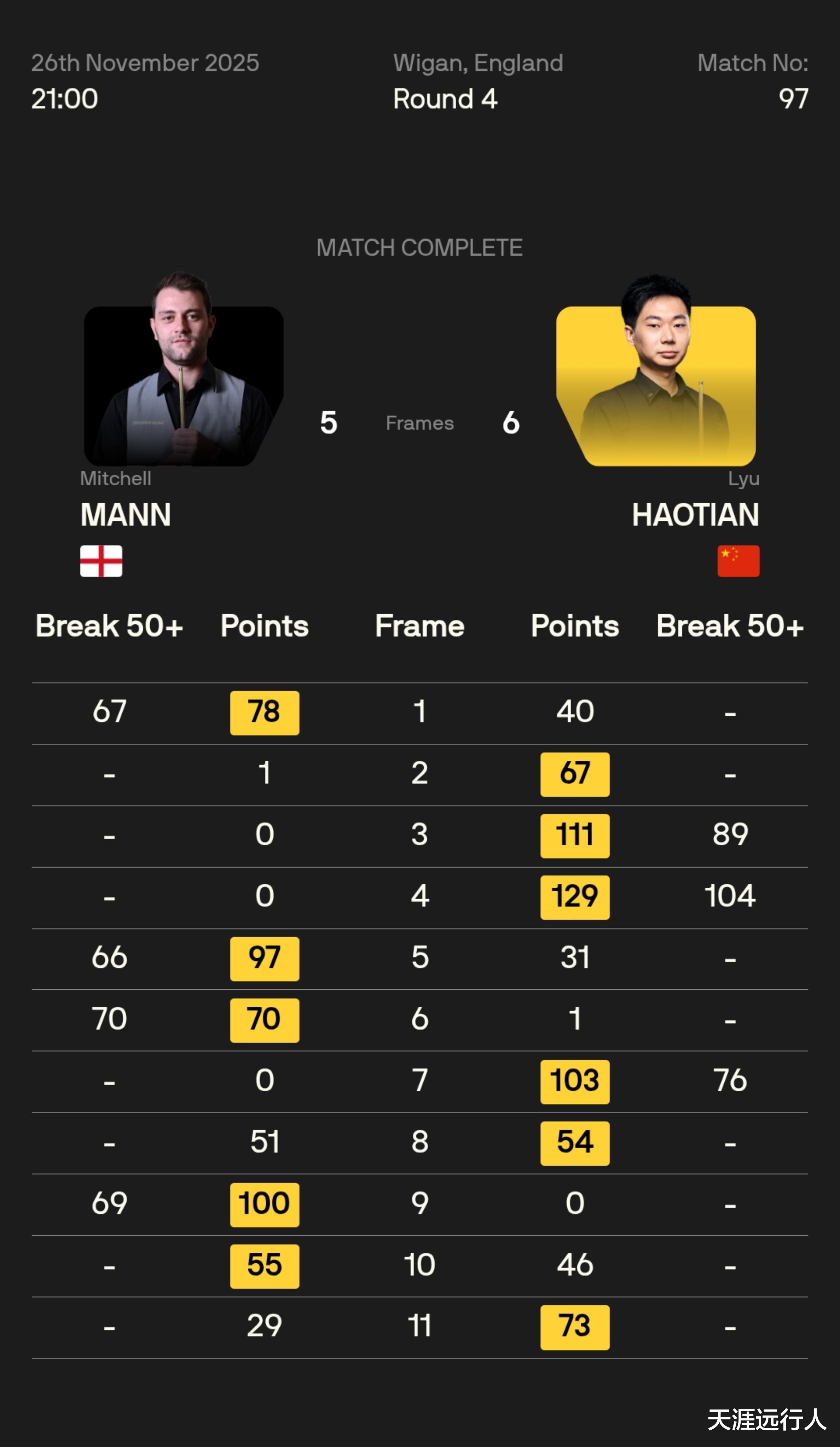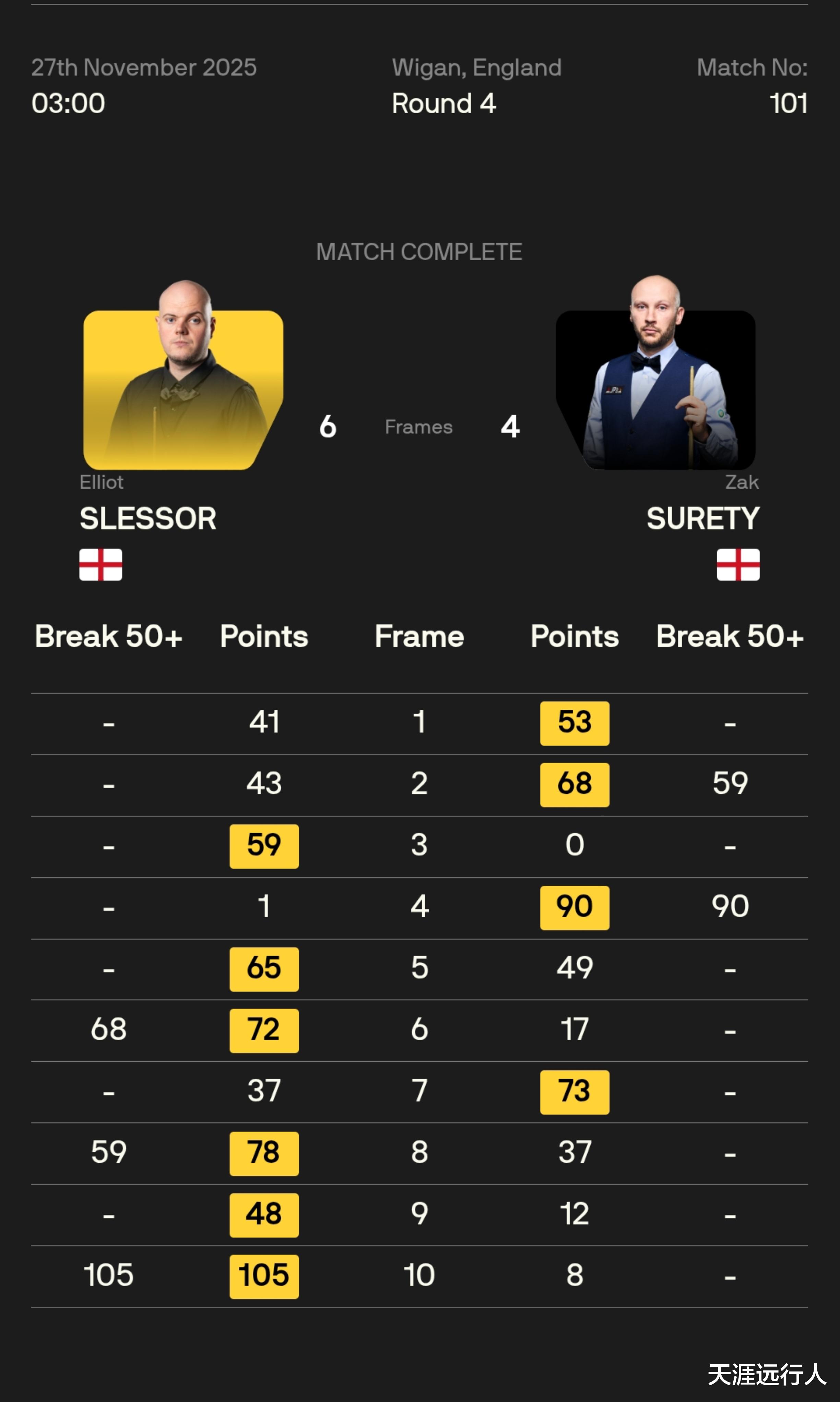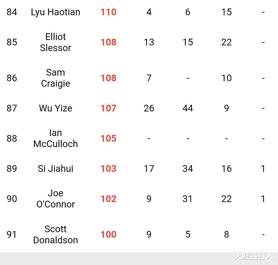这个比赛日共打出11杆单杆过百,中国球员贡献三杆,出局的丹尼尔·威尔斯、宾汉姆、奥康纳打出来四杆“哑炮”,本届英锦赛的破百杆数来到73杆。