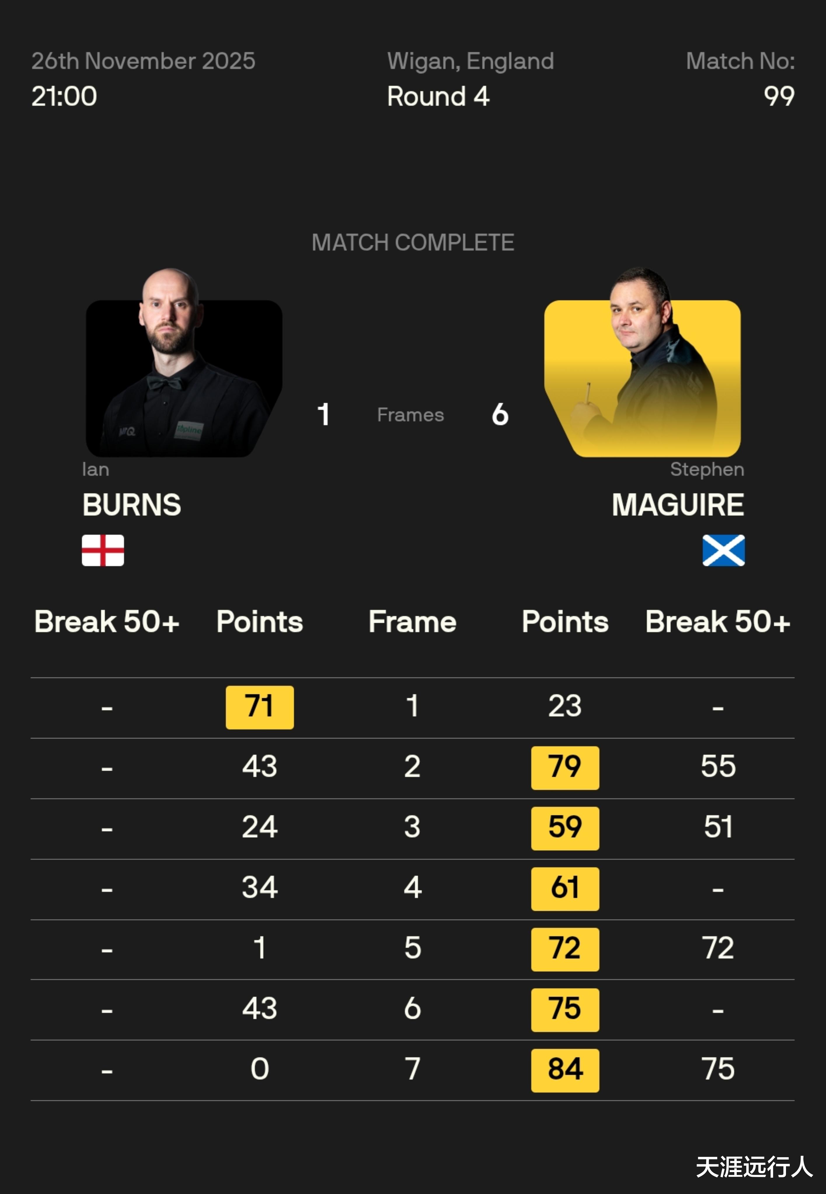 伊安·伯恩斯缠斗中先拔头筹,曾三进英锦赛决赛,2004首次就拿下英国锦标赛冠军的斯蒂芬·马奎尔,再也没给对手机会,打出四杆单杆50+,一波六连鞭卷走胜利,背靠背再次杀进巴比肯中心。