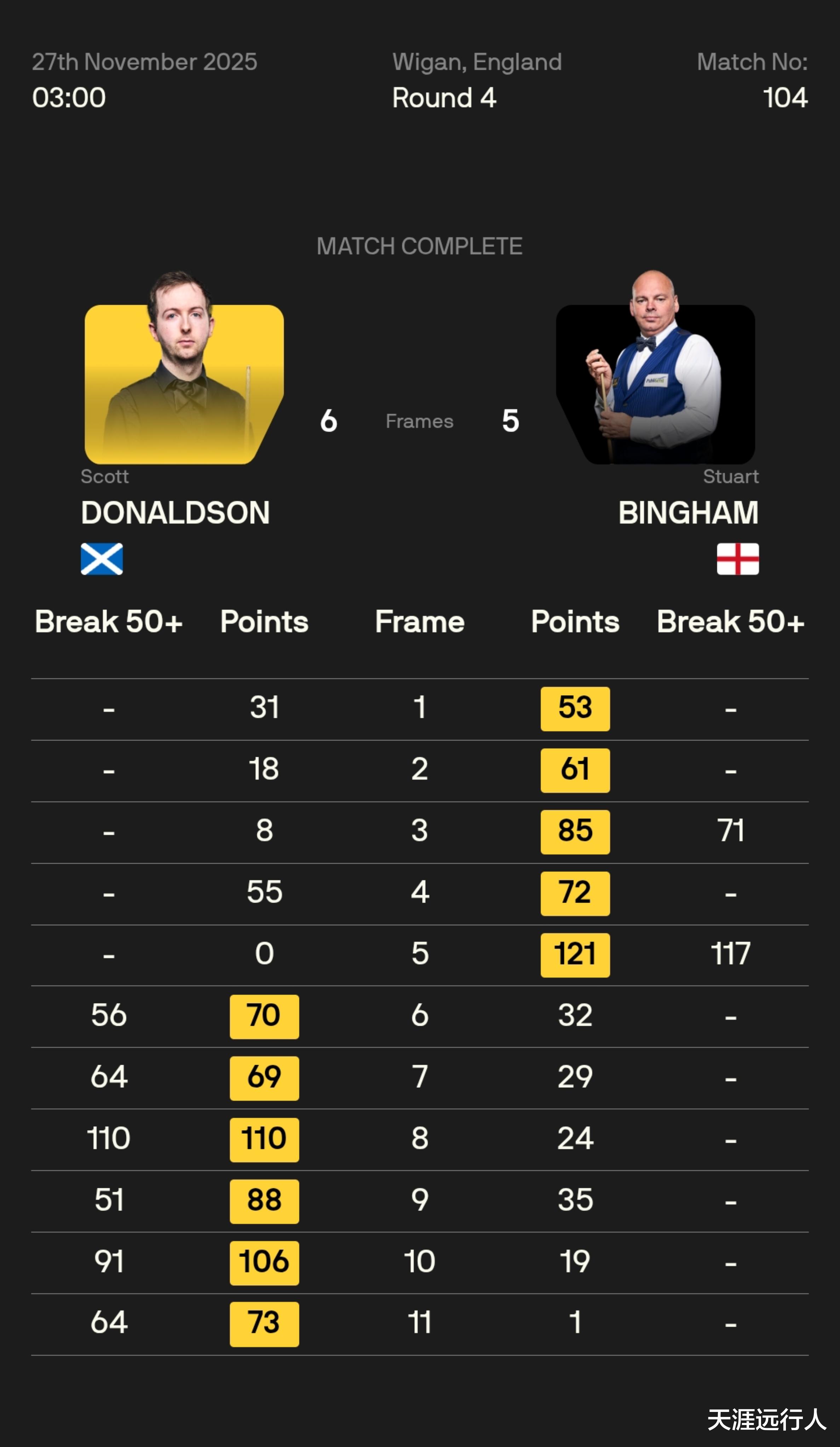 斯科特·唐纳森 6-5 斯图尔特·宾汉姆