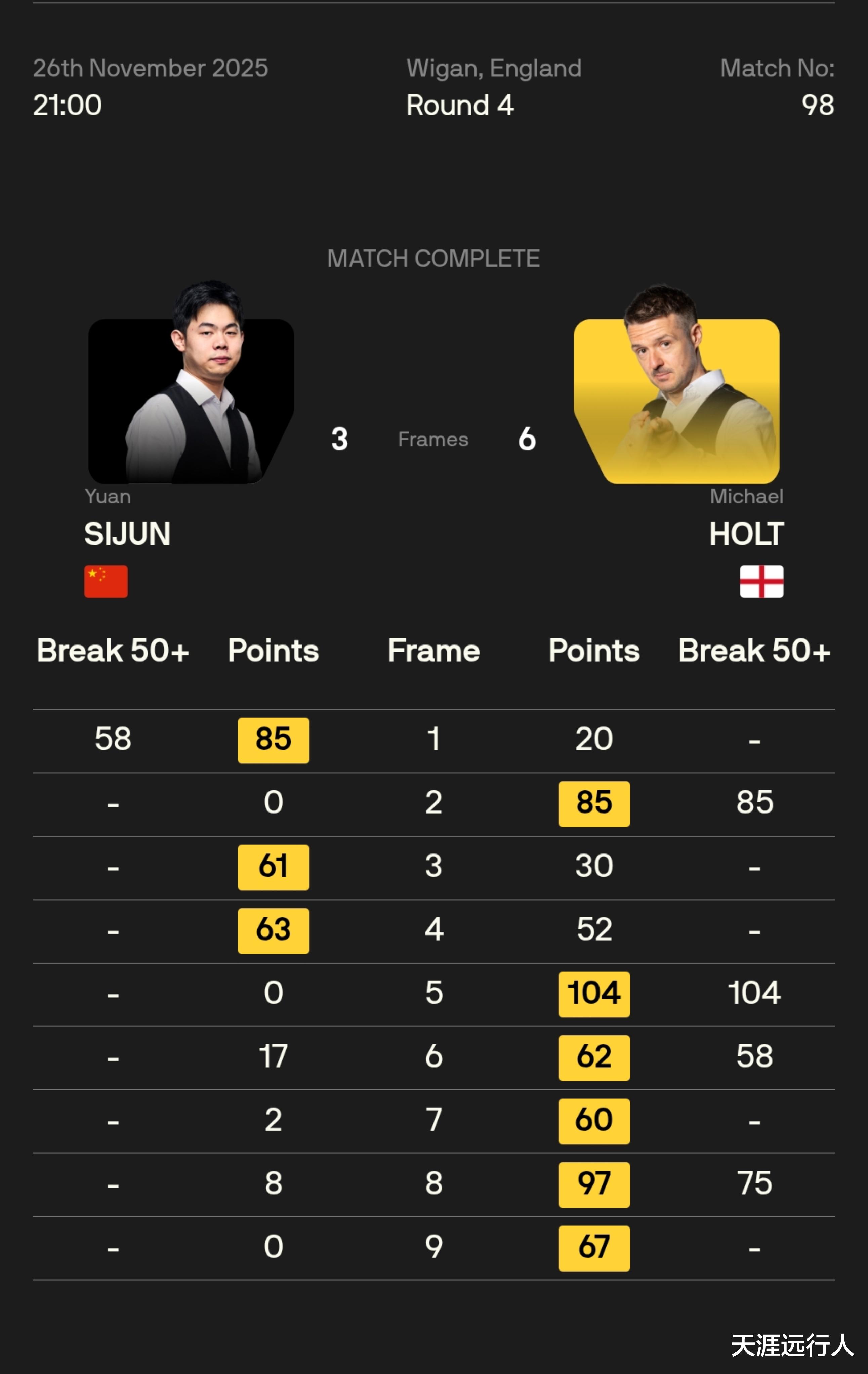 虽说磕磕绊绊,但总算以3-1取得领先的袁思俊,局休之间不知发生了什么,突然失魂落魄,遭“刺客”霍尔特一波五连鞭痛击逆转,后五局仅仅拿到27分,生涯无缘巴比肯中心的悲情依旧,2025年初德国大师赛抢到职业生涯最亮眼的四强之后,本以为会有所突破,没想到还是一水的遗憾。