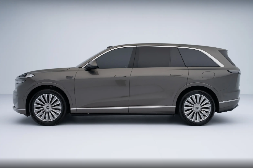车侧部分,乐道L90采用了相对简约的设计风格,而且还是短前后悬的布局,车身长度接近5米15,车宽近2米,轴距达3米11,基于这样的设计和尺寸比例,能够保证内部空间的宽适度。另外,新车也在窗沿、侧裙等位置采用了镀铬饰条点缀,搭配涡扇式21英寸轮圈(前后配备规格不同的米其林轮胎)以及隐藏式门把手设计来看,营造出四平八稳的厚重感。车内采用3排6座布局,符合主流设计。侧裙下方配备伸缩式电动脚踏板,隐藏式设计增强了外观的一体感。