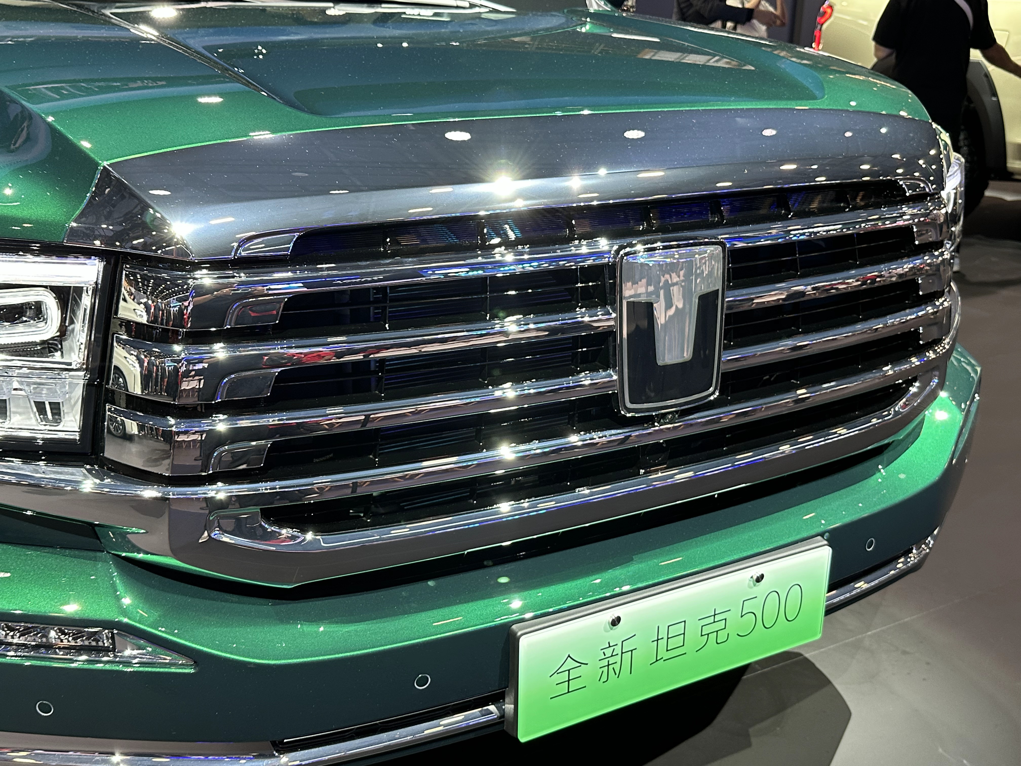 外观方面,新款坦克500整体车身轮廓与在售车型保持一致,前格栅进行重新设计,采用了灵感源自中国古代建筑的“举折中网”,镀铬饰条呈现出由窄至宽的堆叠造型,底部饰条则一直延伸至头灯处。该车头部配备琉璃珀车标,采用镀铟工艺,后方还集成了毫米波雷达,下方则带有远红外热成像模组。