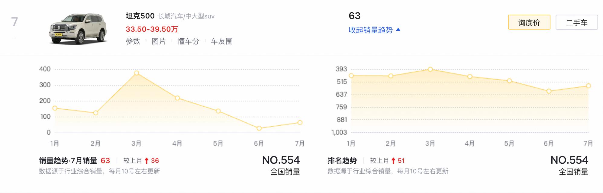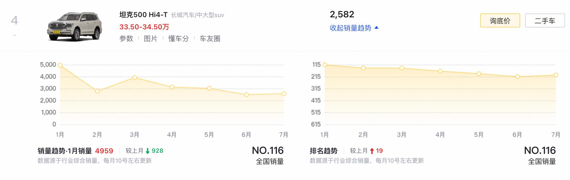 在当前中大型SUV市场,坦克500的主要竞争对手为一汽丰田普拉多(指导价44.98万元起)、长安福特探险者(指导价30.98万元起)等;坦克500 Hi4-T/Hi4-Z的主要竞争对手为方程豹豹8(指导价37.98万元起)。另外,福特智趣烈马虽然定位为中型SUV,但尺寸接近,因此也会成为坦克500 Hi4-T/Hi4-Z的潜在竞争对手。根据懂车帝销量排行榜显示,今年7月,坦克500燃油版车型销量为63辆,插混系列车型销量为2582辆。