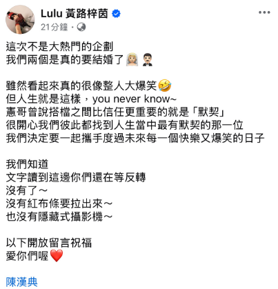 9月11日,陈汉典与Lulu(黄路梓茵)突然宣布婚讯,引发两岸网友哗然。他们特别强调“并非节目效果”,更添真实性。两人看似毫无交集,却因多年工作相伴悄然走近,被调侃为“拼好婚”。其实早在《康熙来了》中,蔡康永就戏称Lulu为“女版陈汉典”,甚至当场撮合,如今竟一语成谶。他们在《综艺大热门》中长期搭档,默契十足,虽屡被节目安排上演亲密桥段,却无人当真。就连吴宗宪也曾放话“若结婚就包200万”,如今只能笑认“红包不会少”。