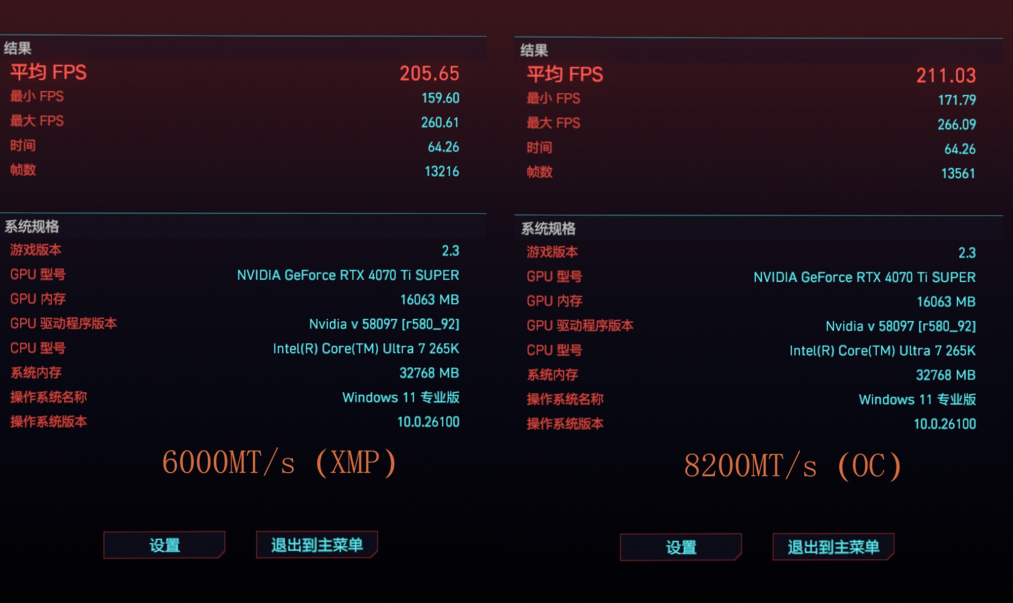 《赛博朋克2077》画面分辨率为1080P,画质设为超级预设档位,开启DLSS超分辨率采样与平衡档位,在6000MT/s CL28状态下的平均帧率为205.65FPS,最小帧率为159.6FPS,当超频至8200MT/s CL38后平均帧率为211.03FPS,最小帧率为171.79FPS。