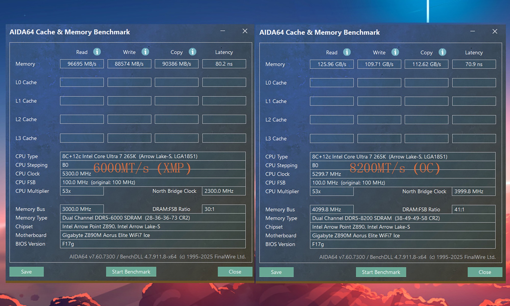 内存条SPD内置两套XMP参数,6000MT/s频率CL28时序状态下内存读取速度为96695MB/s,写入速度为88574MB/s,复制速度为90386MB/s,延迟为80.2ns,然后直接将内存条超频至8200MT/s,时序为38-49-49-58,电压为1.45V,可通过压力测试,此时内存读取速度为125.96GB/s,写入速度为109.71GB/s,复制速度为112.62GB/s,延迟为70.9ns。