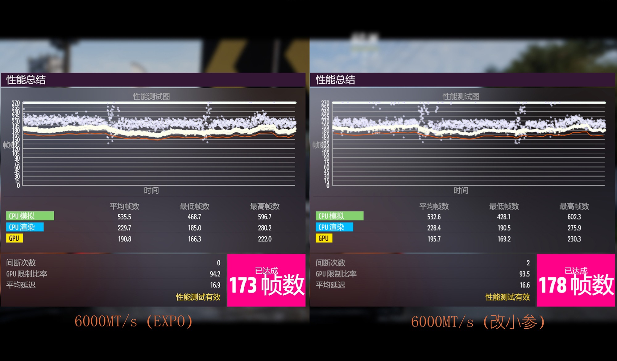 在游戏性能表现方面,《极限竞速:地平线5》游戏中,将画面分辨率设为1920×1080,画质设为预设极端档位,并开启TAA抗锯齿功能,在6000MT/s频率全默认时序参数状态下的平均帧率为173FPS,当修改小参后平均帧率提高至178FPS。