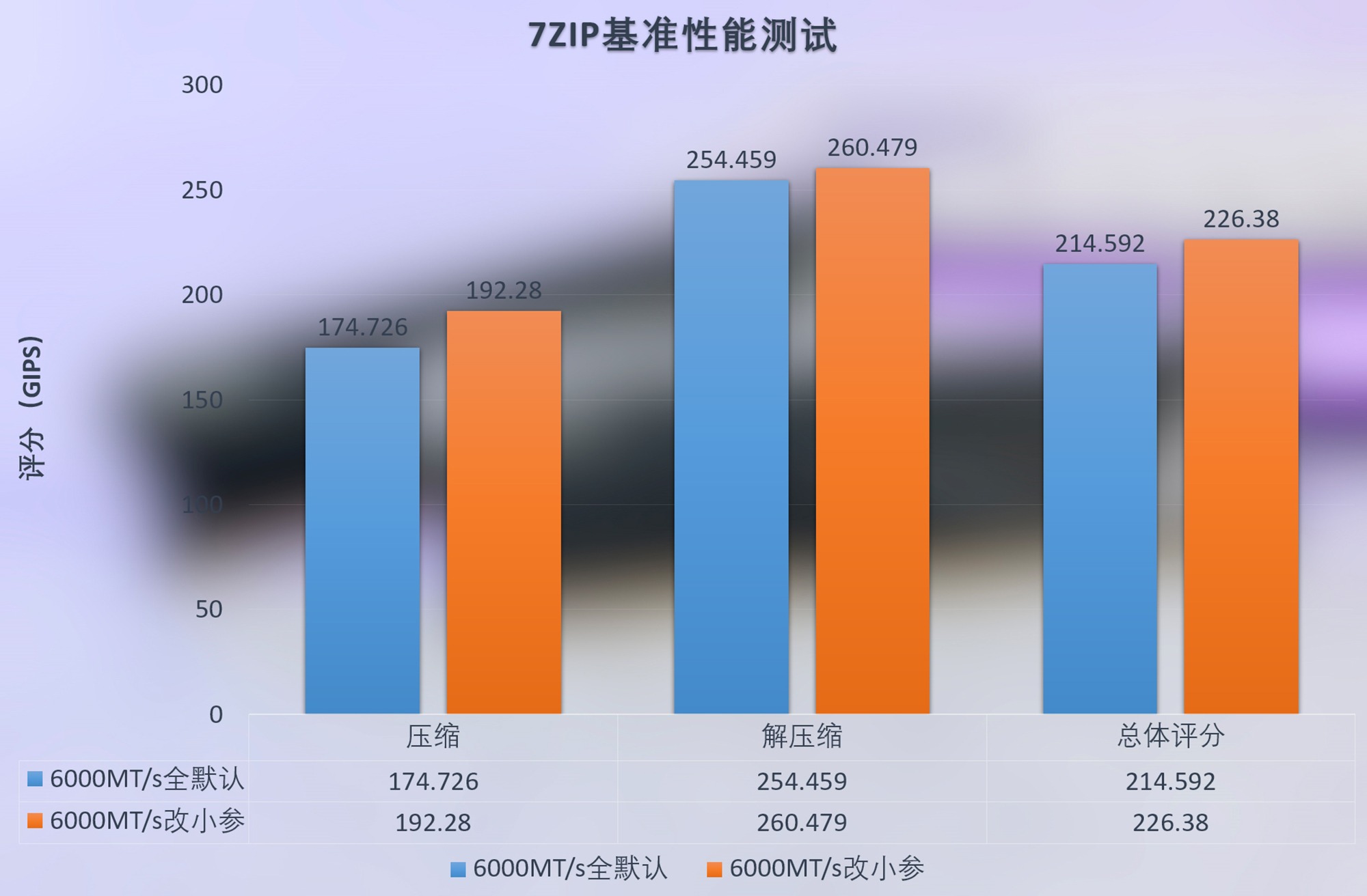 7Zip解压缩基准性能测试,本次将字典大小设为128MB,设定值越大所占用的内存空间越大,在6000MT/s频率全默认时序参数状态下,压缩得分为174.726,解压缩得分为254.459,总体评分为214.592,当修改小参后,压缩得分为192.28,解压缩得分为260.479,总体评分为226.38。