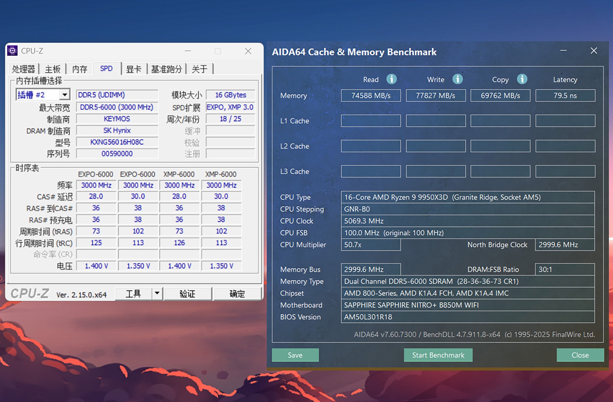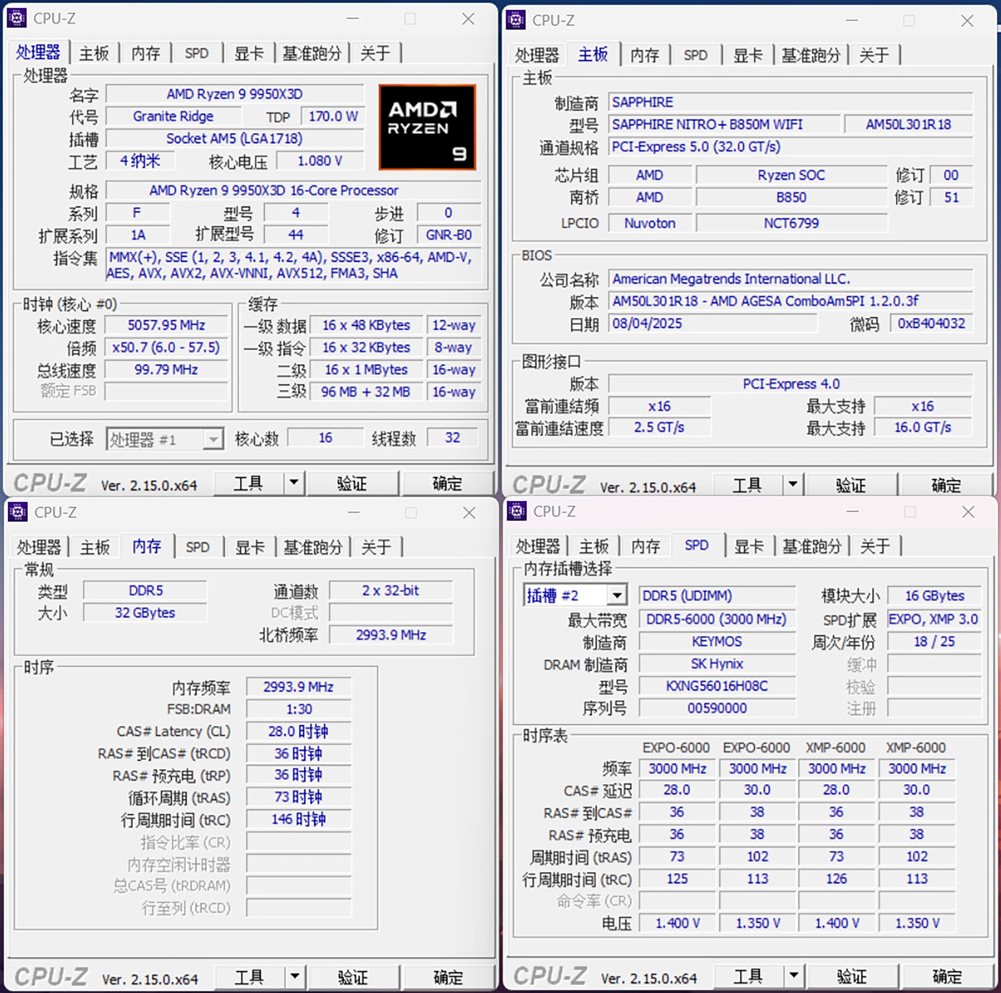 AMD锐龙9 9950X3D处理器采用双CCD架构设计,拥有十六核心三十二线程,本次测试开启PBO功能,根据检测软件CPU-Z所显示,科摩思天河玄女DDR5内存条的SPD中内置四套不同的频率时序参数,XMP与EXPO参数各两套,其中EXPO:6000MT/s CL28、6000MT/s CL30;XMP:6000MT/s CL28、6000MT/s CL30。