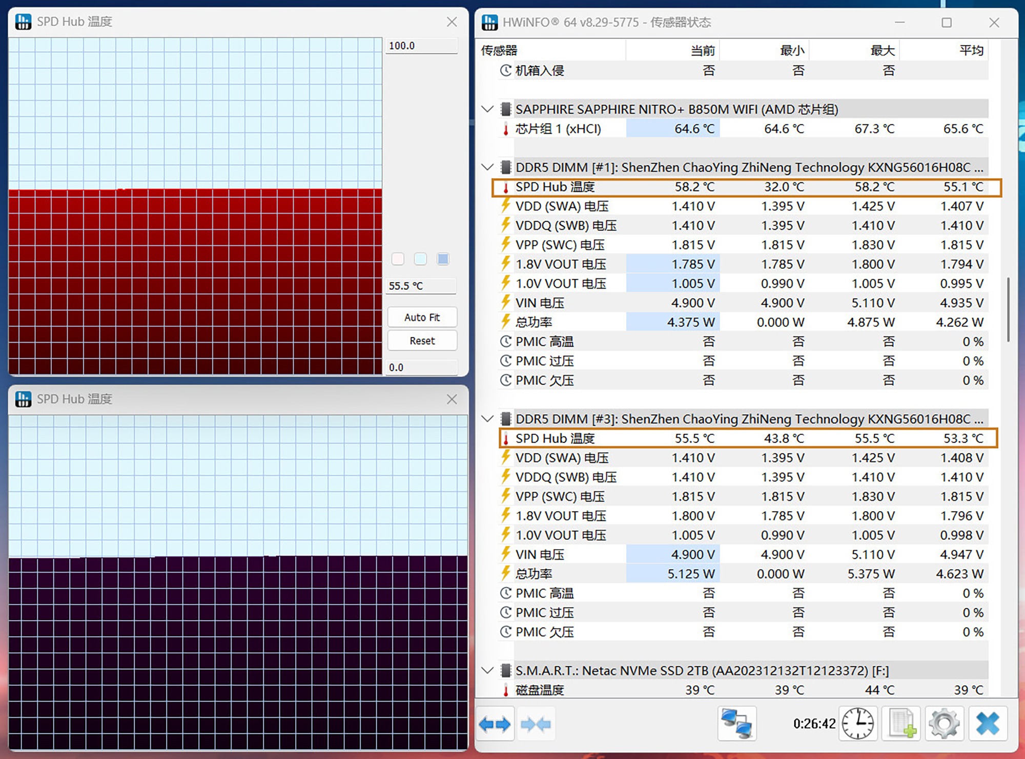 最后说说内存条的散热表现,内存条开启EXPO超频,频率6000MT/s时序CL28,时序小参全部保持默认,室温28℃无散热风扇辅助的状态下,进行二十分钟TestMen5压力测试,期间SPD Hub最高温度为58℃,最高功耗为5.375W,在游戏等中等负载状态下温度约为40℃。
