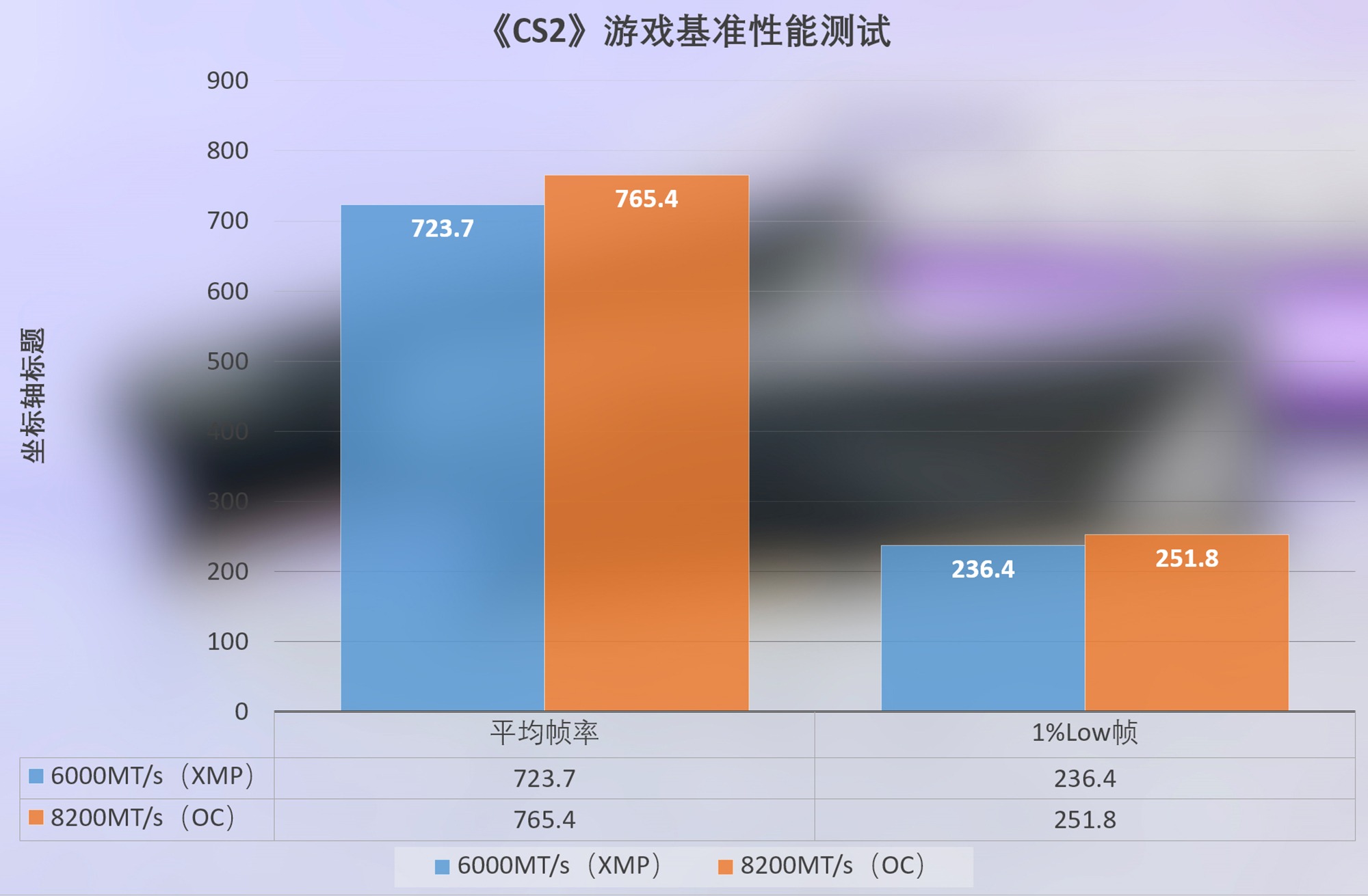 《CS2》游戏画面分辨率为1080P,画质为预设的低档位,在6000MT/s CL28状态下的平均帧率为723.7FPS,1%Low帧率为236.4FPS,当超频至8200MT/s CL38后,平均帧率为765.4FPS,1%Low帧率为251.8FPS,平均帧与1%Low帧分别提高了5.7%与6.5%。