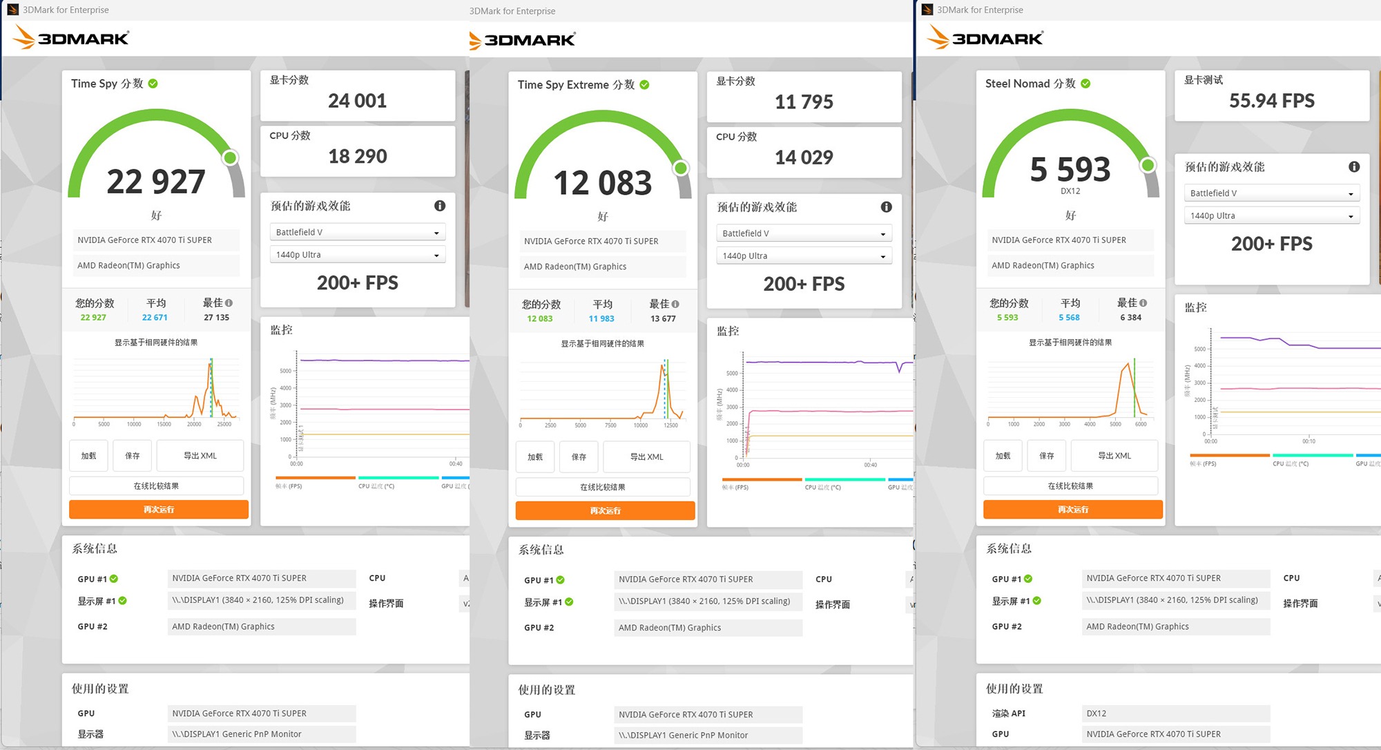 在6000MT/s(EXPO)运行频率下的基准性能测试,3DMark基准测试软件中的Time Spy项目综合得分为22927分,图形得分为24001分,CPU得分为18290分,4K高分辨率Time Spy Extreme项目综合得分为12083分,图形得分为11895分,CPU得分为14029分,Steel Nomad项目的得分为5593分。