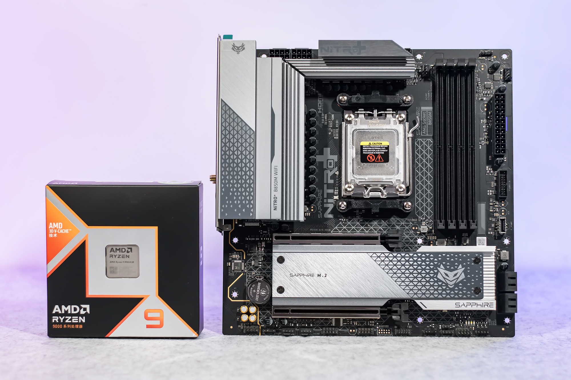 接下来对科摩思天河玄女DDR5内存条进行性能实测,首先在AMD硬件平台上进行,测试平台硬件配置为AMD锐龙9 9950X3D处理器,搭配蓝宝石氮动B850M WIFI主板,显卡为影驰RTX4070TiSuper 16GB金属大师,主板配备四条DDR5内存条插槽,标称内存频率最高可支持8000MT/s+(OC)。