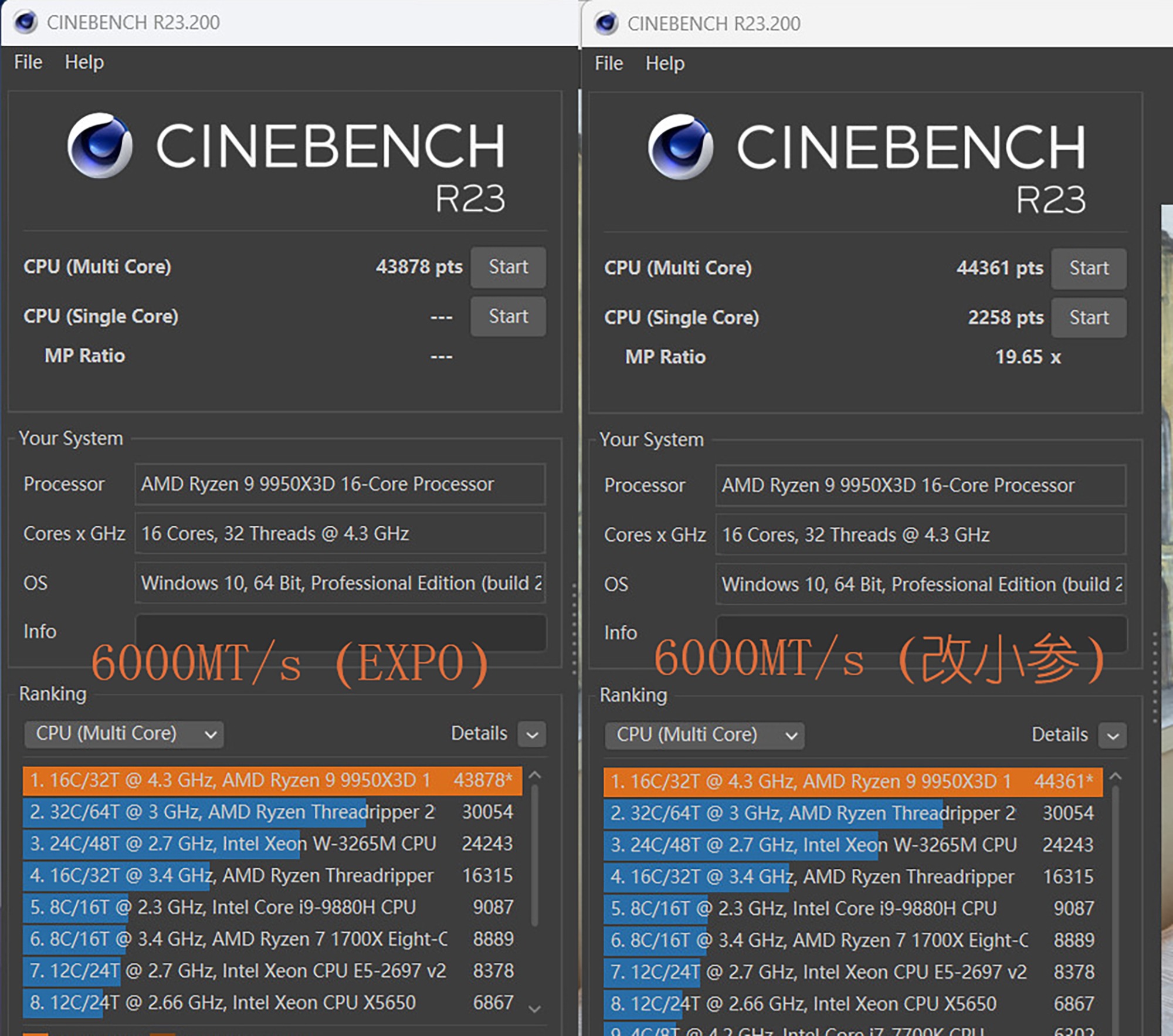 对比修改小参前后的性能表现,在6000MT/s CL28全默认时序参数状态下,锐龙9 9950X3D 处理器在CineBench R23基准测试软件中的多核成绩为43878分,而修改小参后,多核成绩为44361分。