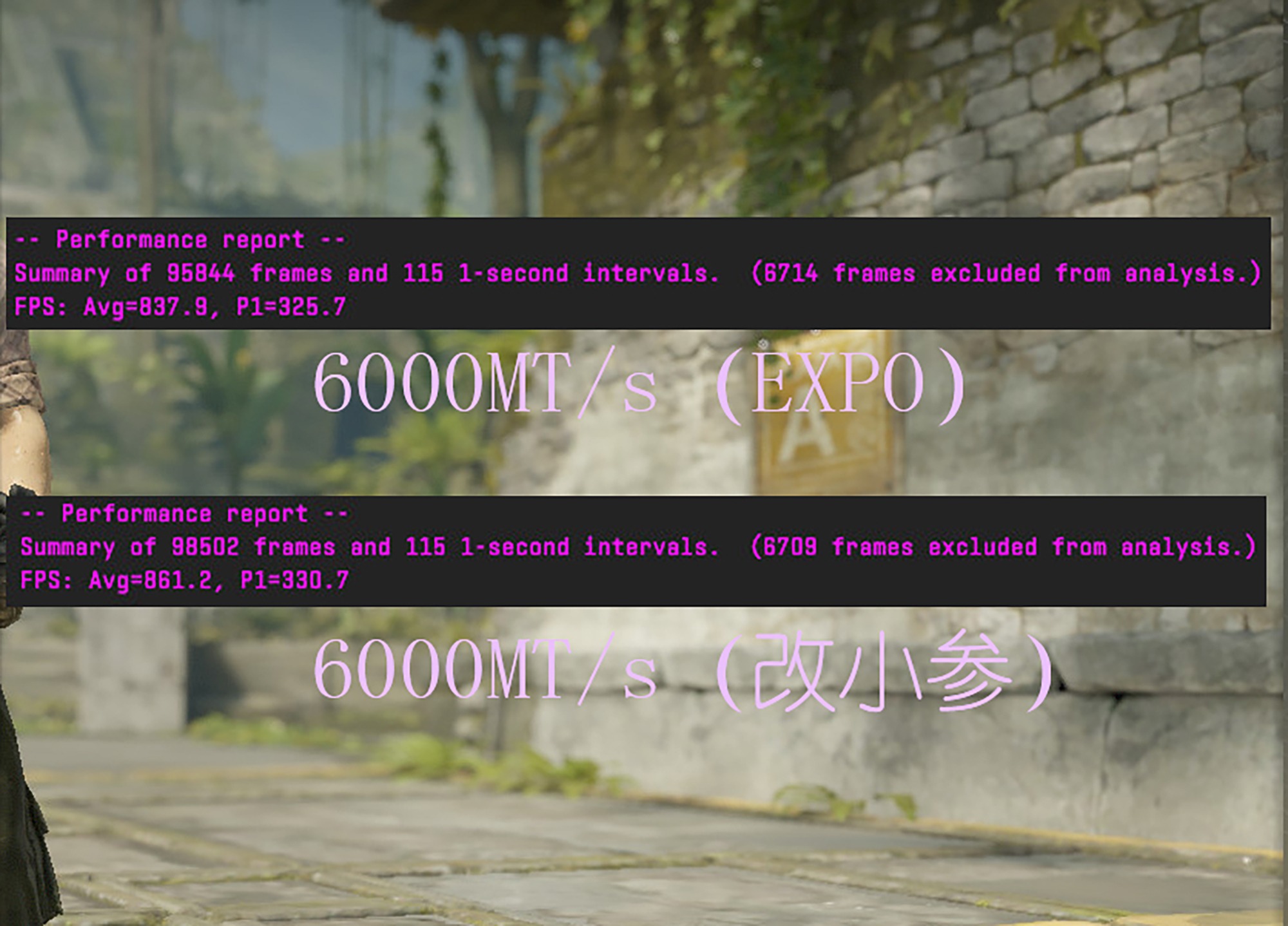 在《CS2》游戏中选择全高清分辨率,并将画质设为低档位,利用创意工坊内的基准测试地图,在6000MT/s频率全默认时序参数状态下的平均帧率为837.9FPS,1%Low帧为325.7FPS,修改小参后平均帧率为861.2FPS,1%Low帧为330.7FPS,1%Low帧升幅并不明显。