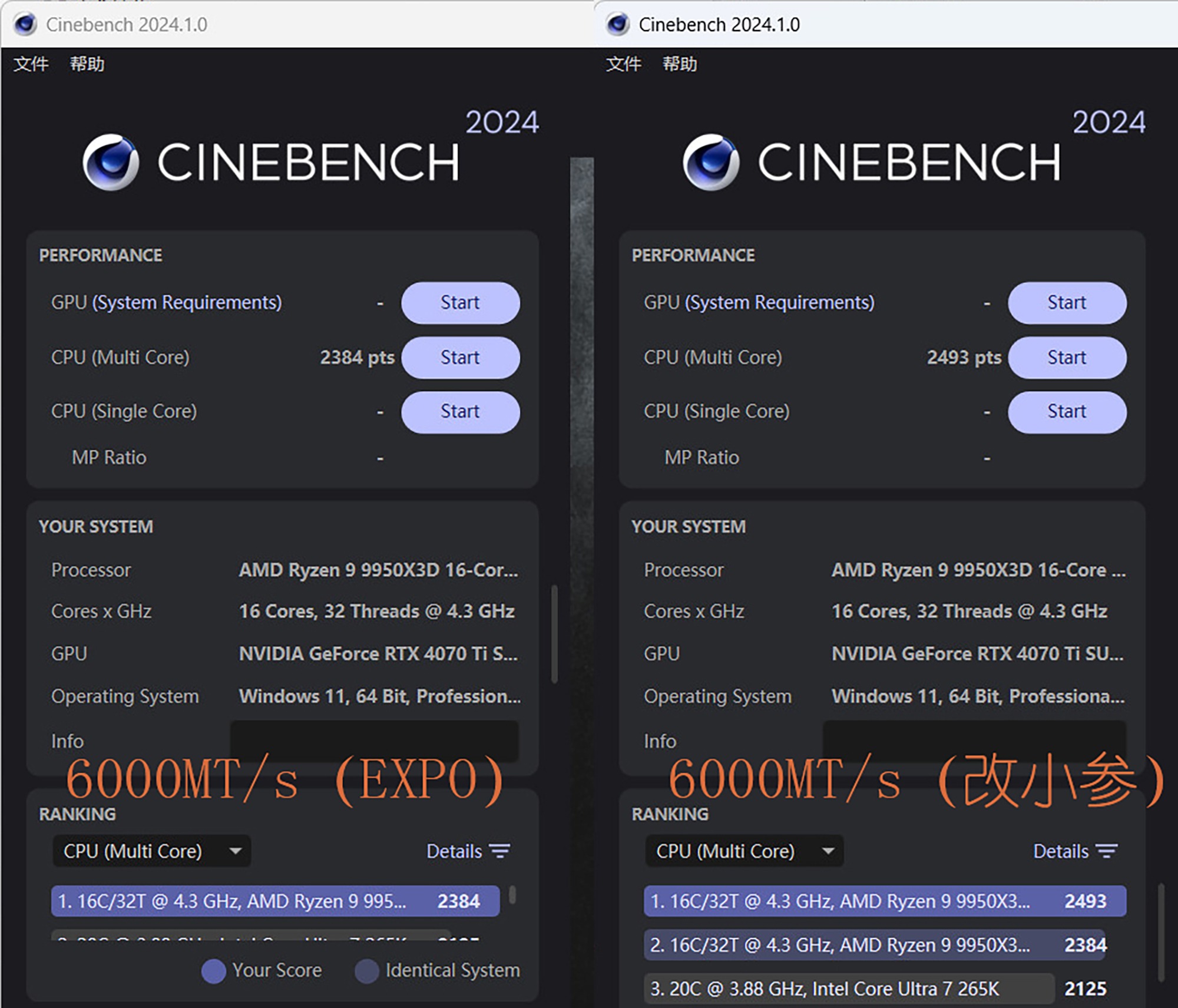 CineBench 2024渲染基准性能测试软件,在6000MT/s频率全默认时序参数状态下,锐龙9 9950X3D 处理器的多核成绩为2384分,修改小参后,多核成绩为2493分,多核性能提升幅度为4.57%。