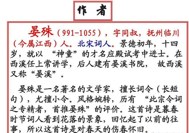 这首词是晏殊最脍炙人口的代表作,表达了他伤春、惜时之意,含有淡淡的忧伤之情,