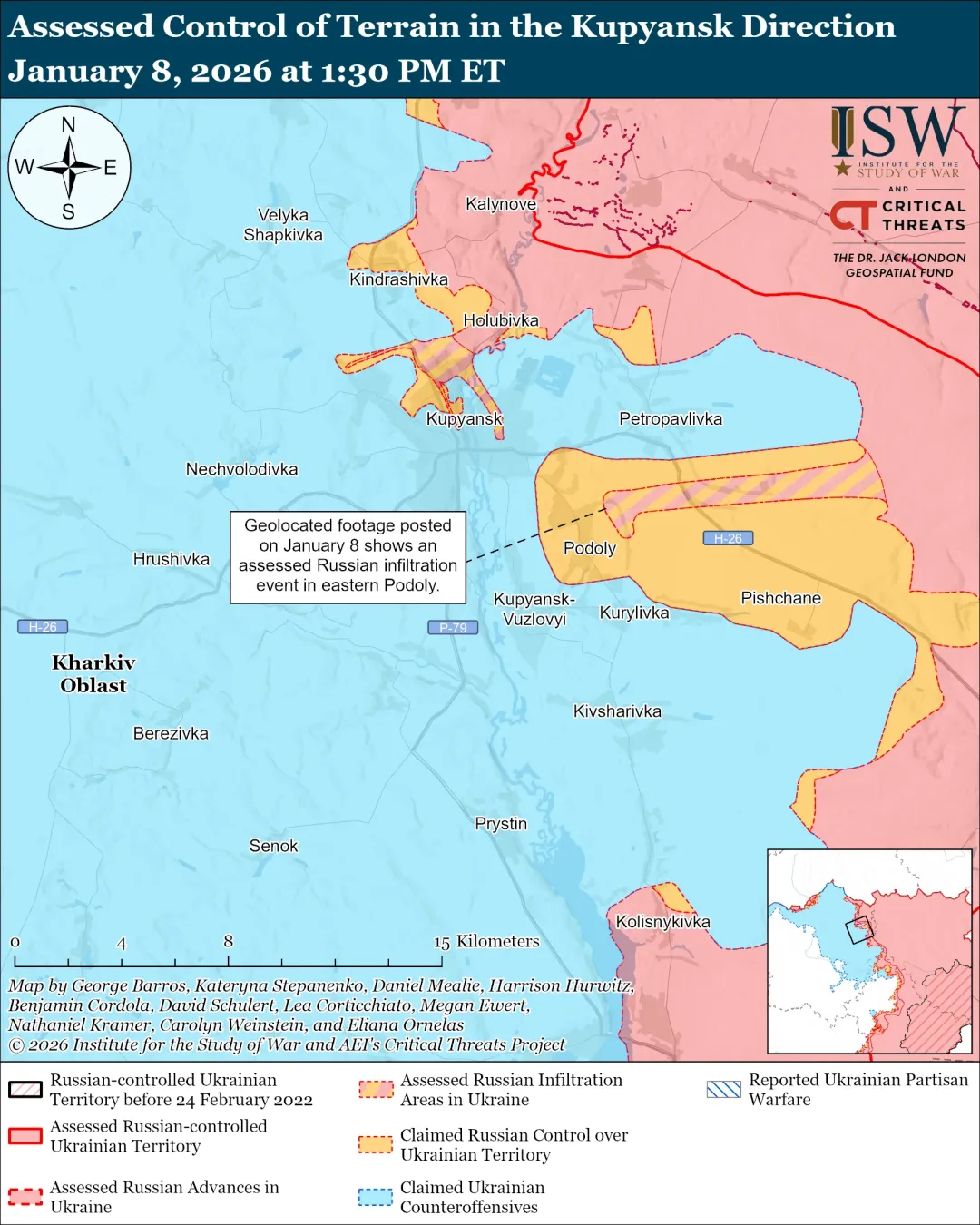 1月7日至8日,俄军在以下地区发动攻击:库皮扬斯克附近;库皮扬斯克北部靠近德沃里昌斯克和金德拉什夫卡,以及朝向库特基夫卡方向;库皮扬斯克东北部靠近菲霍利夫卡;库皮扬斯克西北部靠近蒂申基夫卡;库皮扬斯克南部靠近库皮扬斯克-武兹洛维;库皮扬斯克东南部靠近斯捷波瓦·诺沃塞利夫卡和皮夏内