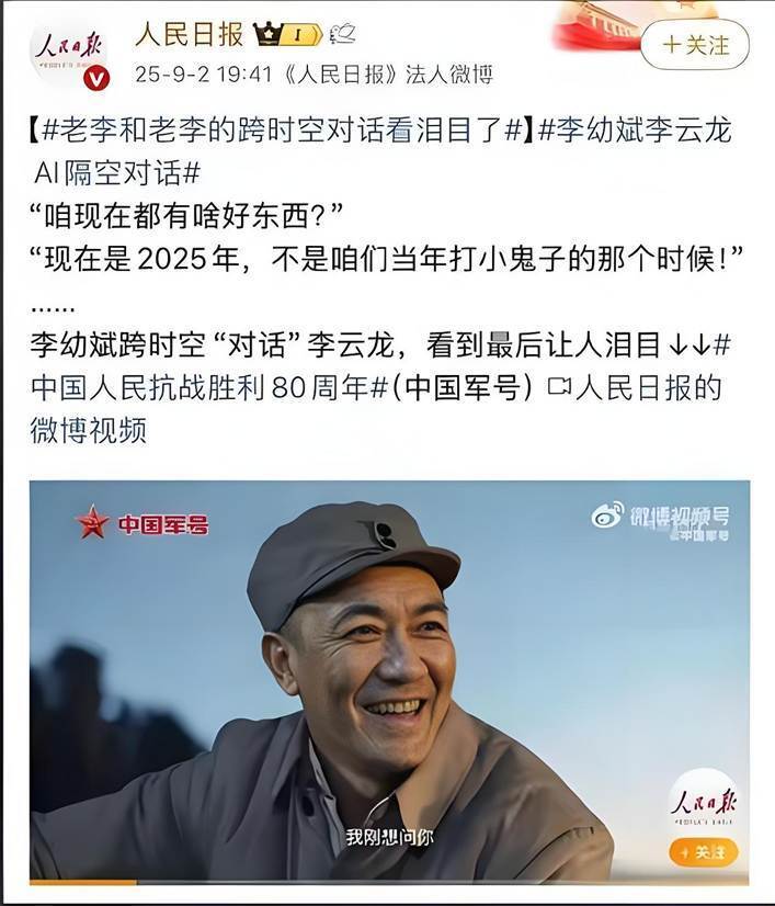 比如前不久的阅兵仪式上,军报还专门请他拍了一个创意视频:让抗战时期的李云龙和现在的他隔空对话。这个策划感染力十足,看得人热血沸腾,好多官方号都转发点赞。
