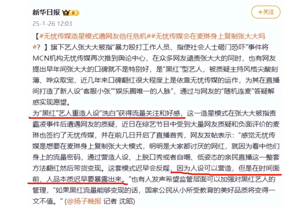 文章最后,《新华日报》提到,有人希望监管层面能够加强对黑红艺人的管理——如果黑红流量能够变现的话,那么大家从小所受教育的美好品质将变得一文不值。