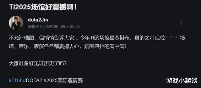 北京时间9月11日下午4点,DOTA2国际邀请赛(TI2025)八强赛将正式于德国汉堡巴克莱体育馆拉开帷幕,而4点开启的揭幕战就是万众瞩目的中国队XG对阵豪门Tundra。本次TI八强赛依旧会有线下开幕式,根据前线主持人Jin发布的动态来看,TI2025的场馆星罗棋布,场馆、音乐、表演都震撼人心,本次开幕式和赛场的氛围感都会拉满。