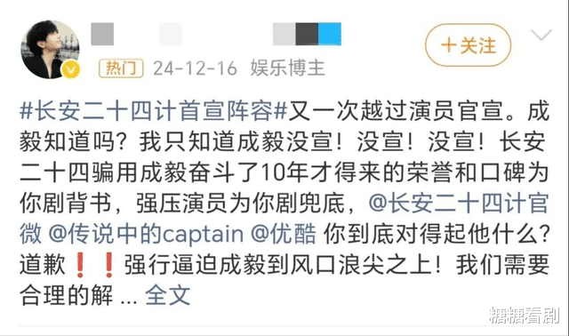 最重要的是长安二十四计的公宣方向把重点放在了一位少年和6位大佬的对弈上,这对于观众来说确实是拉高期待,对剧是好事,但是对于成毅而言是把他放在火上烤。而且成毅老师的原声台词实在不好评价。