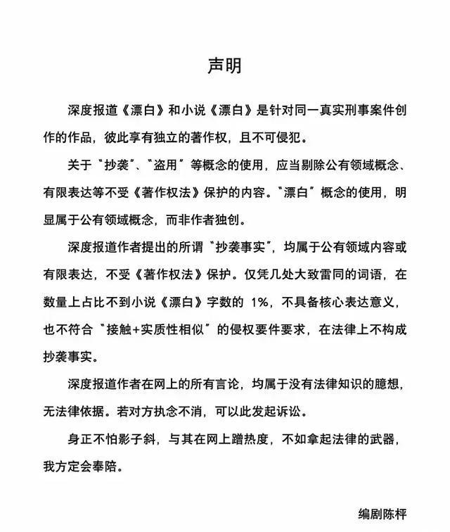 王猛身份存疑,可能是新近崭露头角的新人,也可能是因某事件处于舆论焦点的人物。《漂白》这部作品想必颇具关注度,或为即将上线的热门剧集,亦或是备受期待的电影。一种可能是王猛借《漂白》相关话题,发表模棱两可言论,误导大众以为其与《漂白》联系紧密,借此提升自身曝光度。另一种可能是王猛在公开场合对《漂白》内容、创作理念发表不当评价,编剧认为这是恶意蹭热度,损害作品声誉。作品如编剧的孩子,容不得他人随意抹黑,任一种情况都足以使编剧直接喊话以正视听。