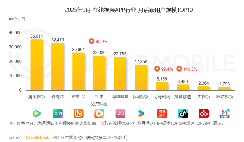 据调研机构QuestMobile数据,2024年3月,红果短剧MAU(月活跃用户数)就已达到5400万,位居国内在线视频行业第六,微短剧领域第一,彼时红果短剧的人均单日使用时长已达1.38小时,超过了爱优腾芒等长视频平台;上线1年后,2024年9月,红果短剧MAU已超过1.2亿;2025年9月,在国内在线视频APP的MAU排行中,腾讯视频(3.5亿)、爱奇艺(3.2亿)、芒果TV(2.6亿)分列前三,红果短剧(2.4亿)位居第四,B站(2.3亿)和优酷(1.7亿)紧随其后,排名第七的是点众科技旗下微短剧平台河马剧场(5158万)。