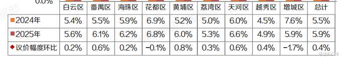 但这份“稳定”的背后,是业主们真金白银的让步。目前二手市场仍以降价促成交为主,据广州中原研究发展部统计,全市平均议价幅度扩大至5.9%,对比去年同期增长0.4%。其中,增城、花都两区议价空间最高,分别为7.6%和6.9%。