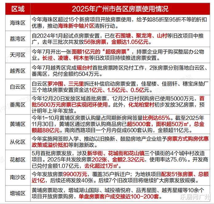 值得一提的是,今年“房票”成为推动市场成交的“黑马”。数据显示,2025年广州通过房票认购房源约5500套,认购面积超55万㎡,认购资金约98亿元。全市11个区都有房票成交,承接房票项目总共110个。
