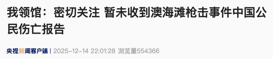 总台记者从中国驻悉尼总领馆获悉,截至目前,领馆未收到邦迪海滩枪击事件中关于中国公民伤亡的相关报告。领馆正密切关注事态进展。
