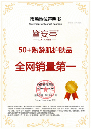 2025年8月26日,国内权威市场研究机构尚普咨询集团,为黛安蒂正式颁发了《黛安蒂50+熟龄肌护肤品全网销量第一》市场地位认证书!尚普集团采取专家评估法、竞品对比法、联合评估法进行三重论证,并对大量市场数据进行交叉验证,在论证结果之后,正式确认:2024年黛安蒂50+熟龄肌护肤品全网销量达954吨,以绝对优势斩获“50+熟龄肌护肤品全网销量第一”市场地位。这份认证背后,是黛安蒂7年深耕熟龄肌领域的初心坚守、硬核科研实力与精准产品布局的综合印证,更标志着国货品牌在50+护肤“银发蓝海”中树立起科技与温度兼具的新标杆。