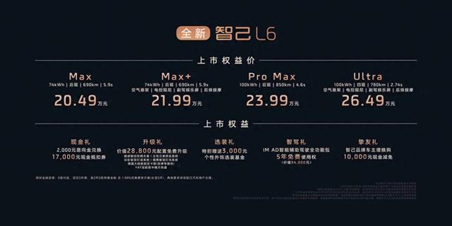全新智己L6推出四大配置版本,官方指导价21.99万元~27.99万元;限时上市权益价格分别为: