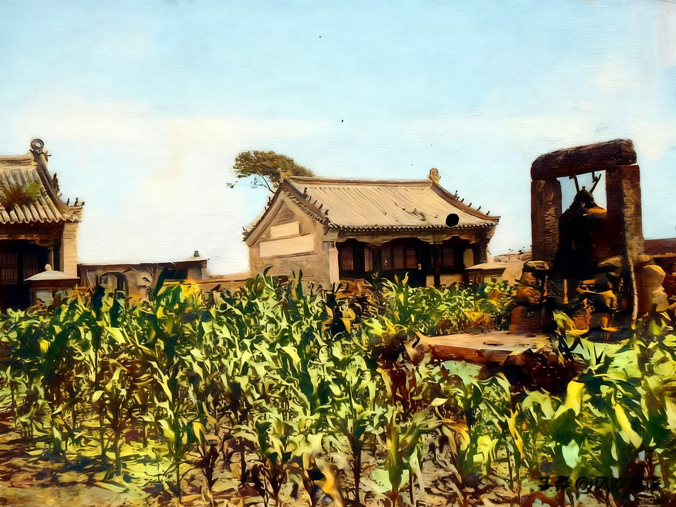 海神庙东侧是一座三皇庙,里面供奉的燧人氏、伏羲氏和神农氏,这里是当地农民祈求风调雨顺、家人平安的地方。两座庙前都种满了高粱,在中间的位置,立着一只造型古拙的石头钟架,上面挂着一口大钟,看样子已经有些年代了。