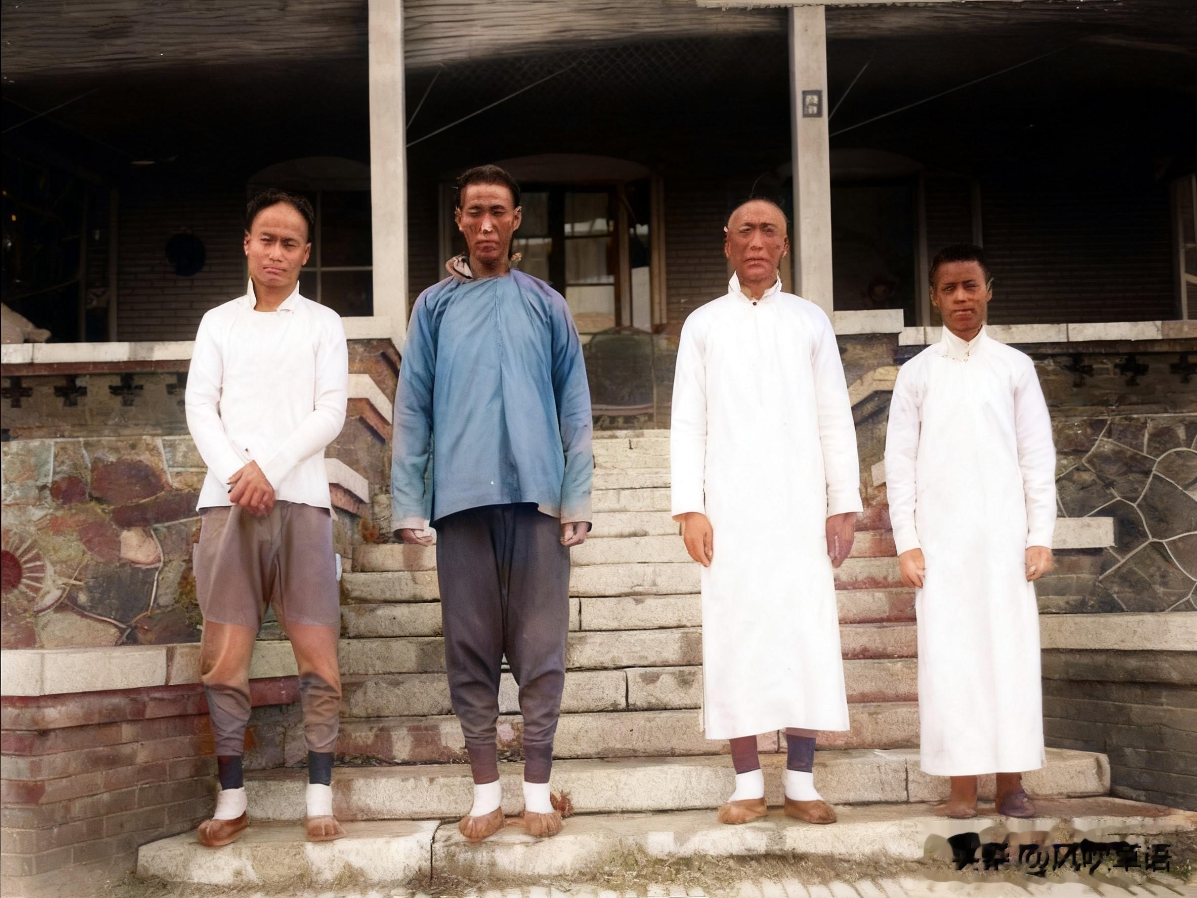 这是几名为洋人服务的中国仆人,他们的穿着打扮代表他们从事着不同层级的工作,短打扮者是体力劳动者,干的是卖力气的杂活,比如马夫或杂役之类,而穿长袍的人从事的是脑力劳动,比如管家之类。