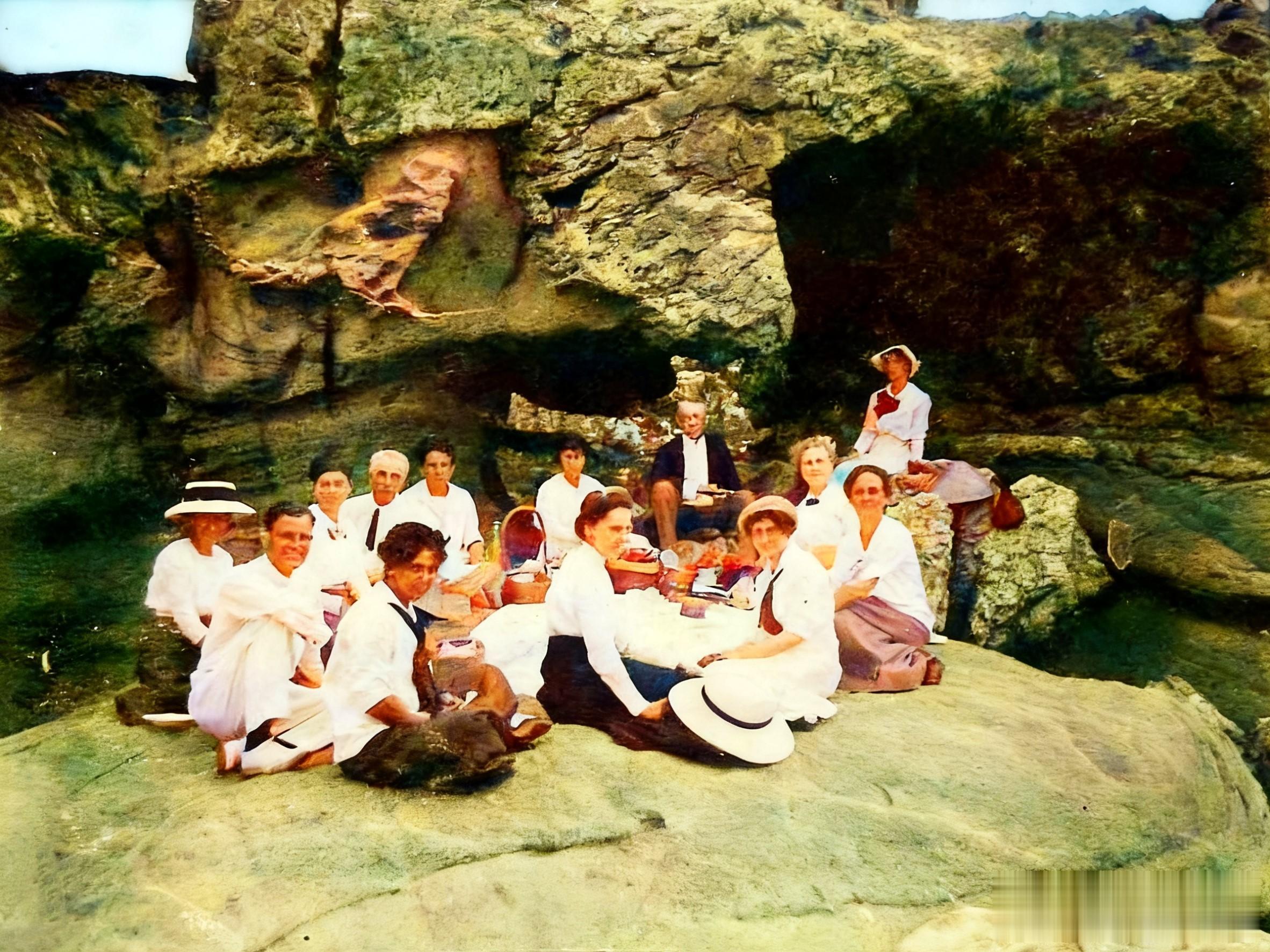 洋人们围坐在一起,打开带来的食盒,准备野炊。在和煦的海风伴着海浪拍打礁石的声响享受美食,的确十分惬意。和同时代的中国普通百姓的生活相比,他们真是宛如活在天堂一般啊。