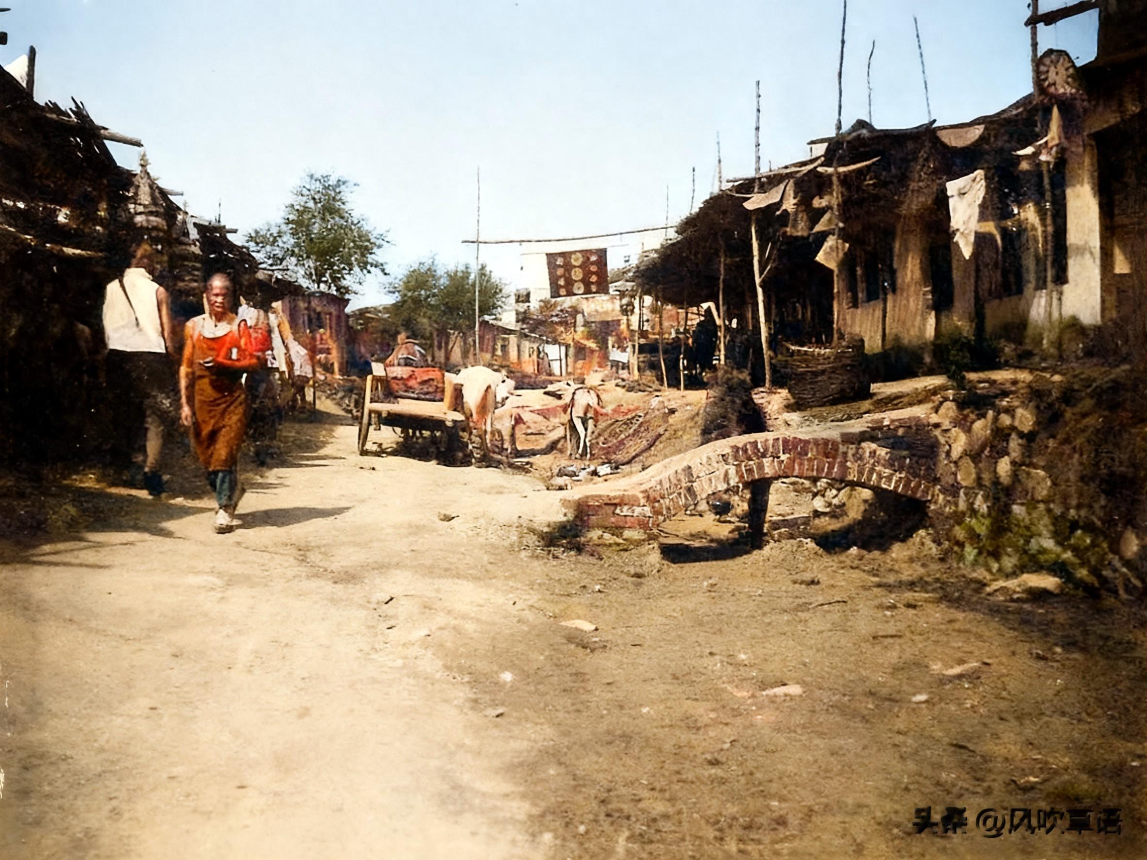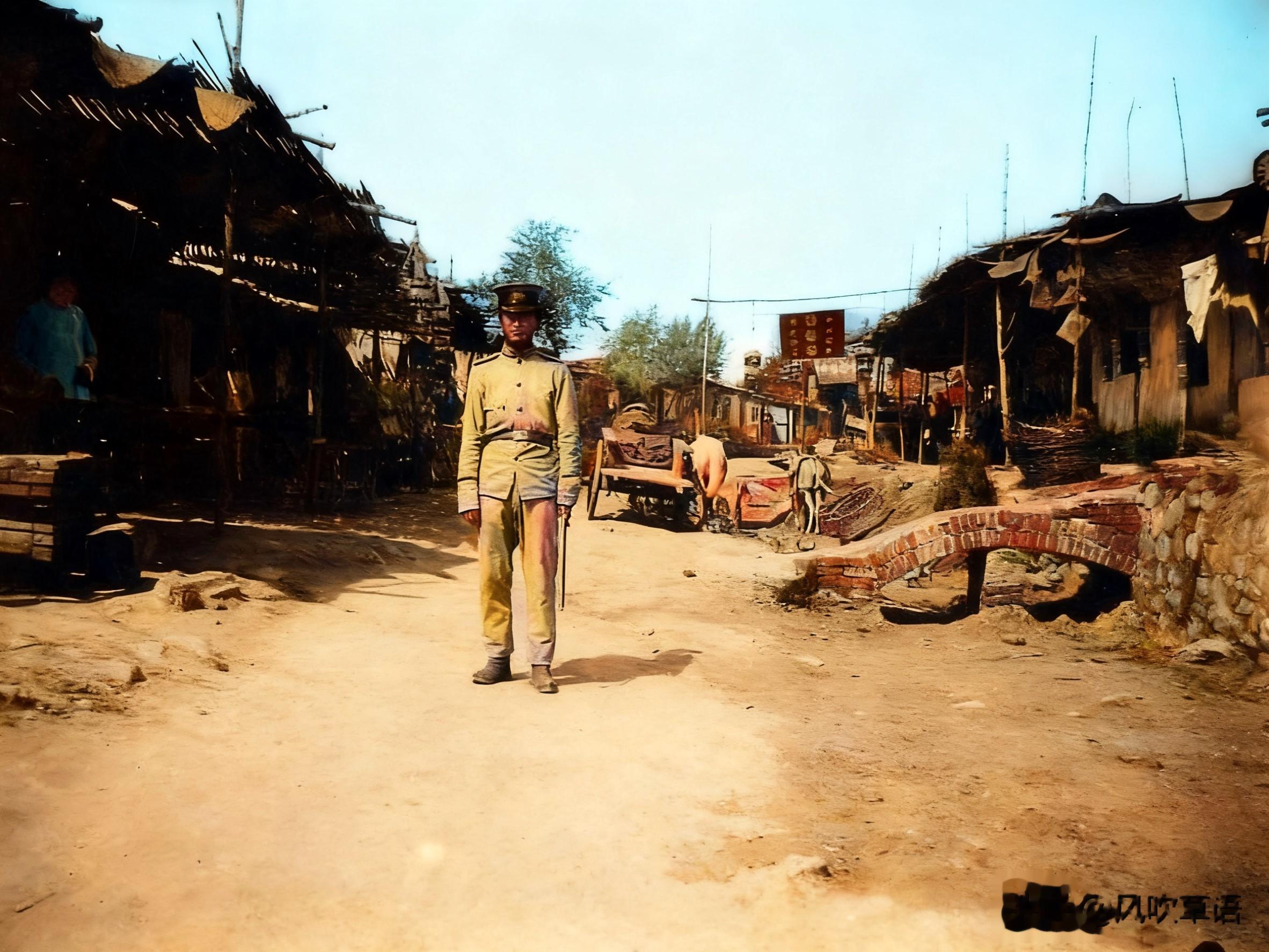 这是当年北戴河刘庄的街景,道路坑洼不平,街道两旁是简陋的房屋。此时已是民国,依然可以看到个别梳着辫子的行人穿梭于狭窄的街道间。路边是一条干涸的排水沟,上面架着一座小砖桥。