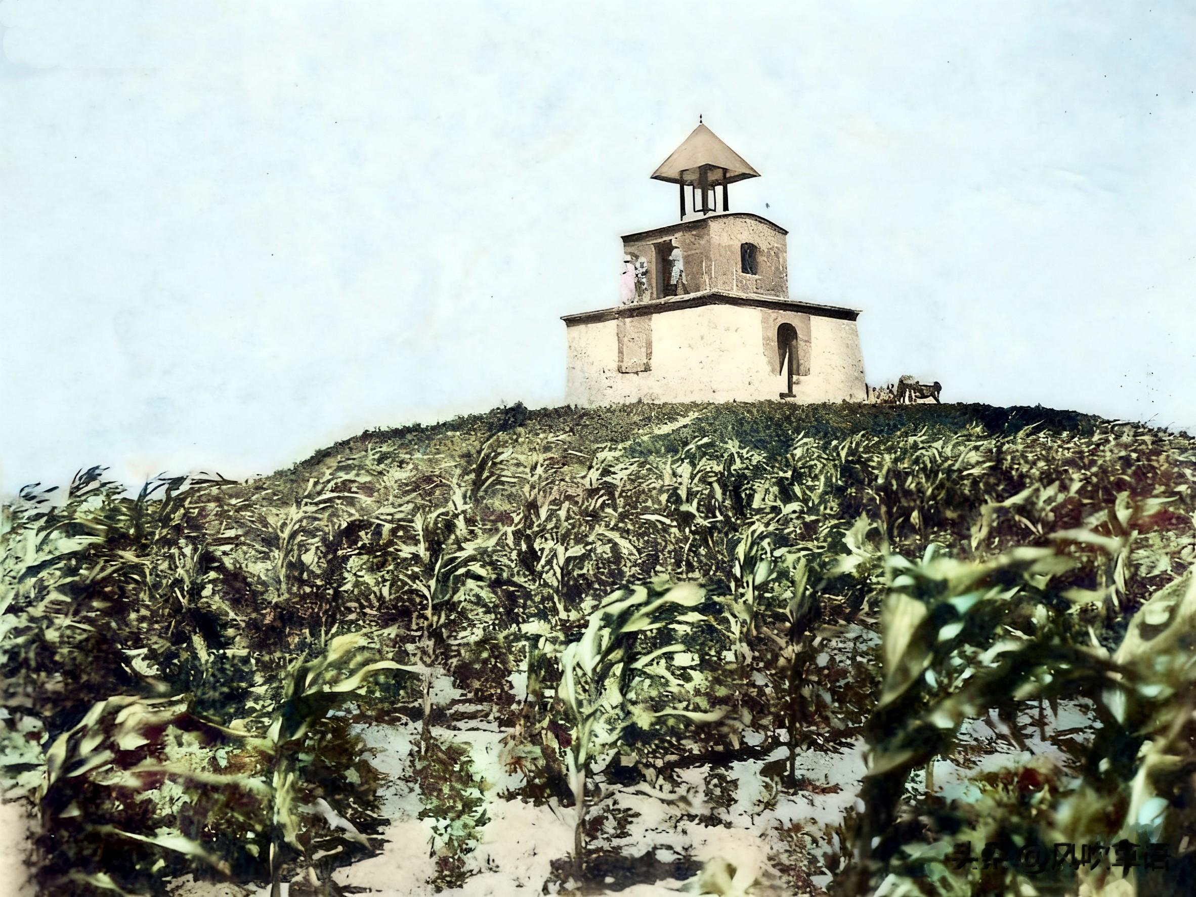 位于北戴河最东端的金山嘴灯塔,三层建筑,画面中有三个洋人正在灯塔的二层游玩。 在灯塔旁遗留一块旗杆的底座, 上面刻着 “乾隆五十八年(1793 年)”的字样。这里曾是秦始皇东巡碣石驻跸之地,专家推测,此处曾经有过一座宏大的宫殿,灯塔就建在宫殿的废墟之上。