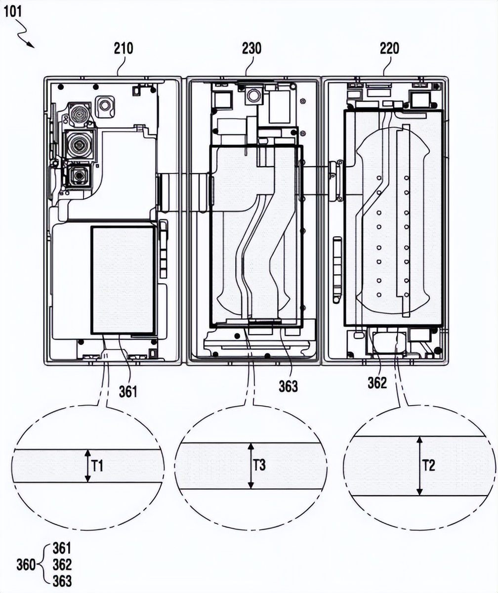 由于其三折叠设计,手机被分为三个相连的面板。根据专利草图,每个部分都容纳了一块独立的电池单元。