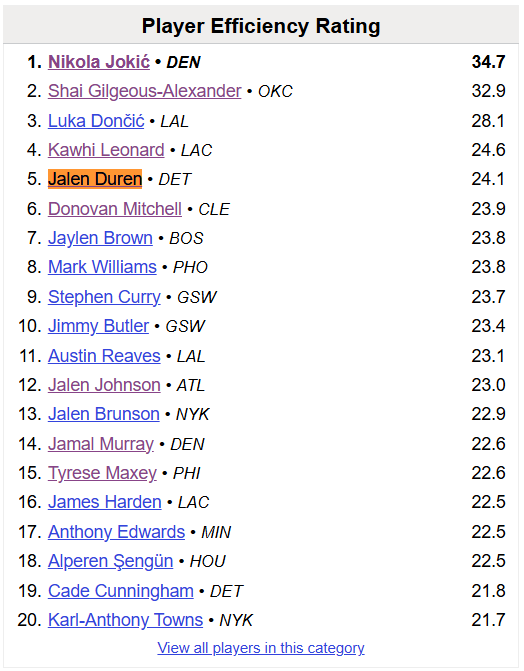 虽然防守端杜伦还不够出色,防守站位、嗅觉、护框习惯都需要提升,但进攻端,杜伦已经成为活塞的绝对支柱,数据上也能证明,本赛季: