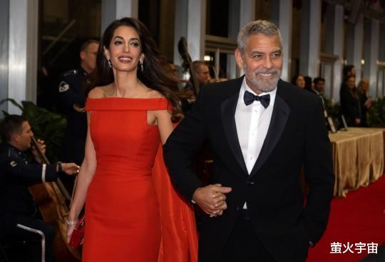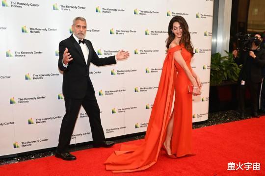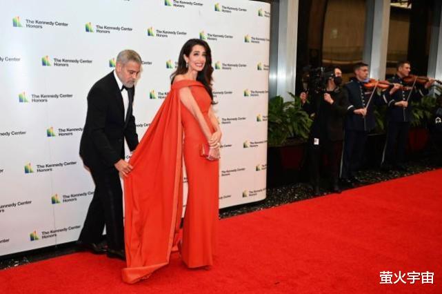 活动当天,44岁的阿迈勒盛装陪同丈夫领奖,一袭及地露肩红裙的她惊艳亮相,同色系的包包和高跟鞋与晚礼服相映成趣,十分好看。而一头褐色长卷发搭配银色耳环,更是让这位美女律师气场全开,看起来美极了。