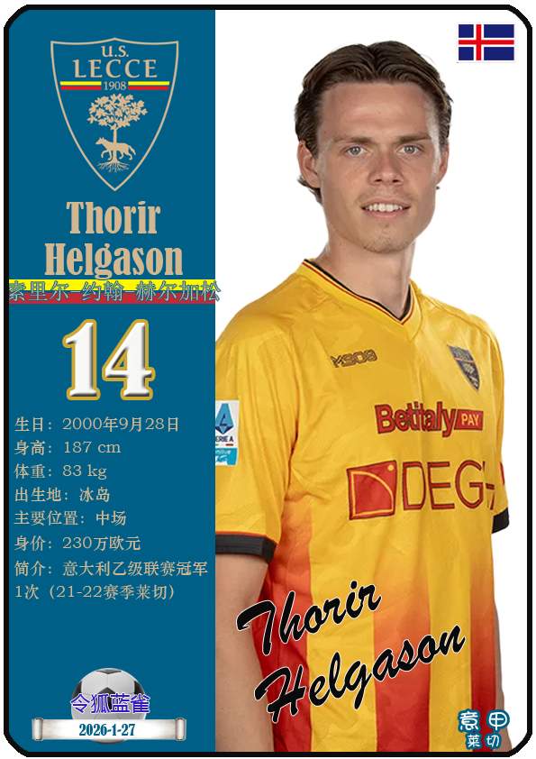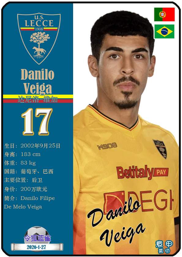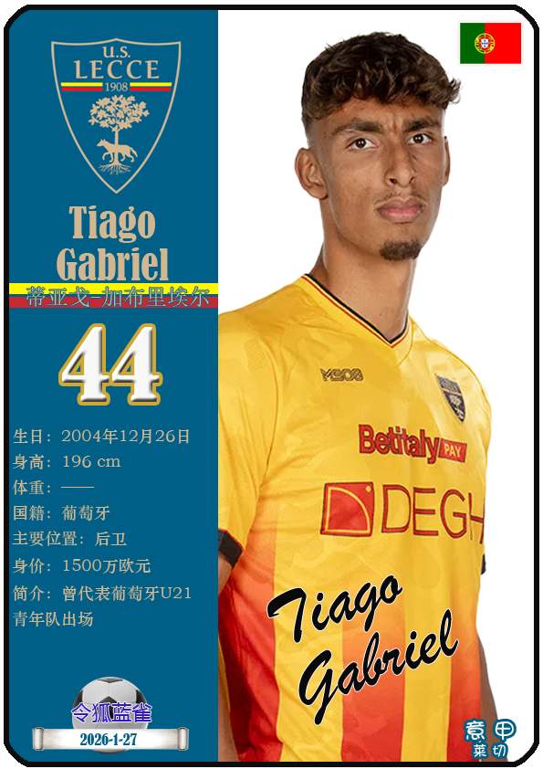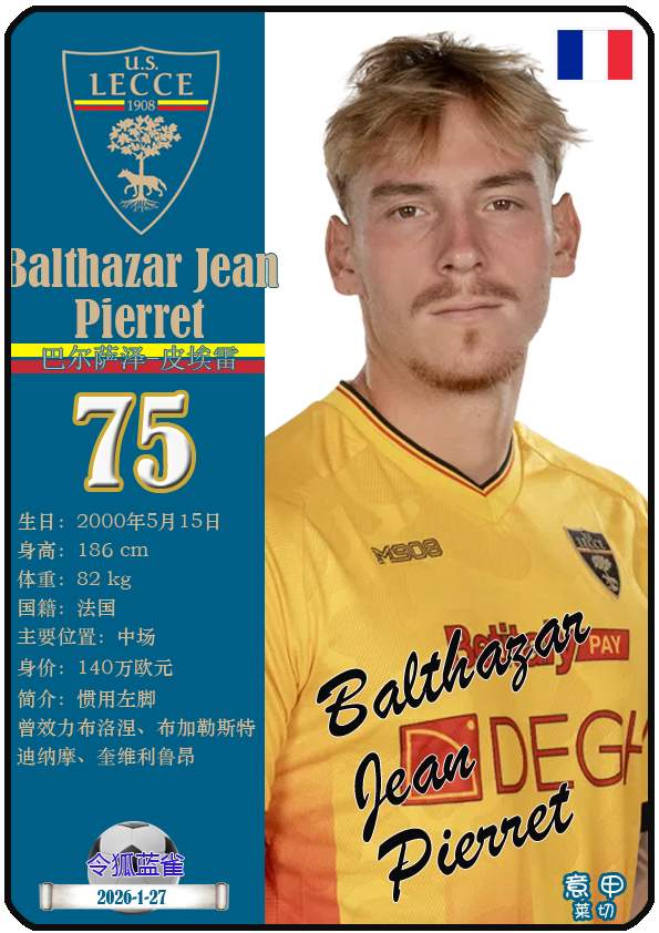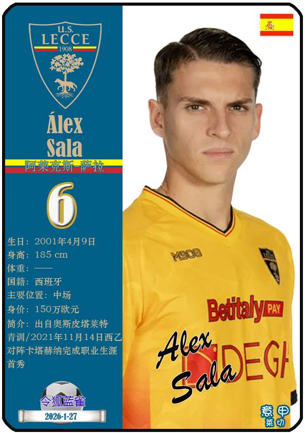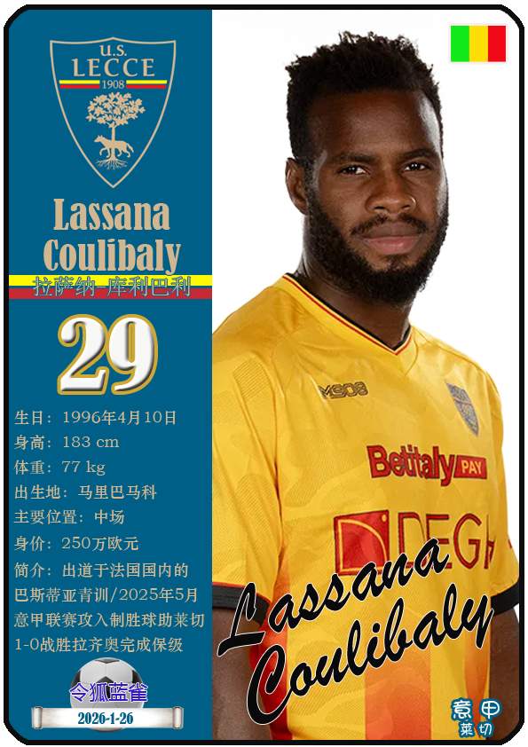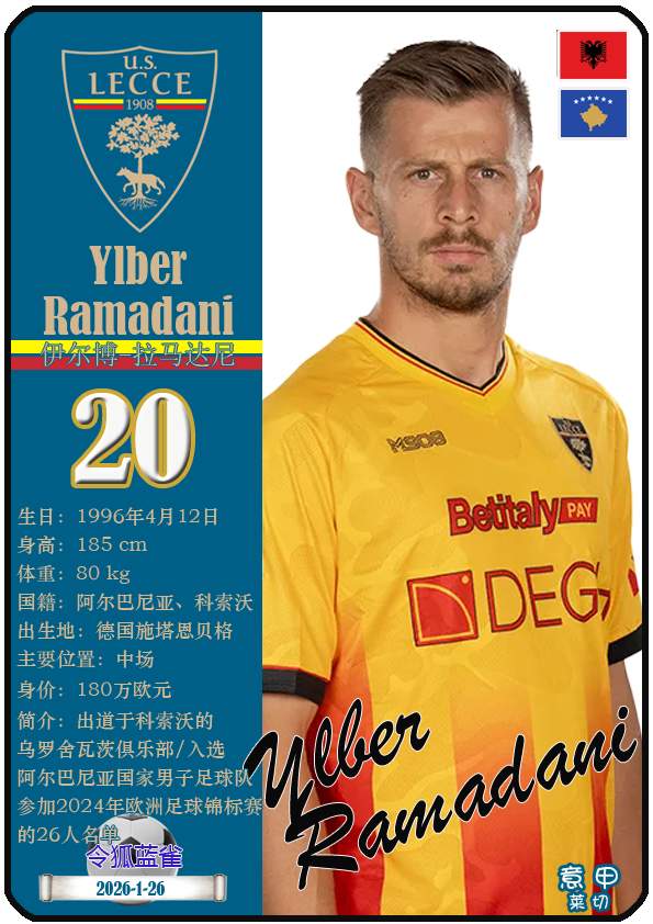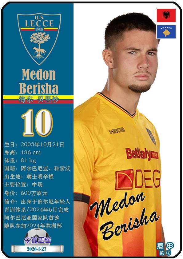 意甲莱切足球俱乐部成立于1908年3月15日,距今已有118年历史。截至2026年1月27日,球队主教练是尤比西奥·迪弗朗西斯科,队内拥有球员梅东-贝里沙、尼古拉-斯图利奇、特特-莫伦特等。本期以球星卡的形式展示目前意甲莱切足球俱乐部的29名球员(按球衣号码排序):