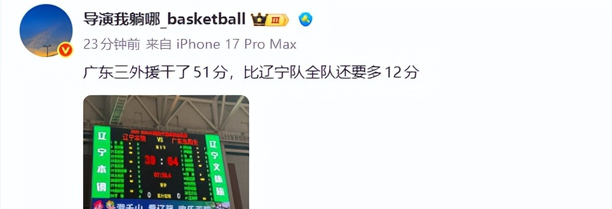 导演我躺哪说出了两队之间的差距,整个上半场广东队的3个外援加一起得到51分,比辽篮全队得分还多,在外援方面,辽篮除了威尔斯能够得分外其余两名外援根本不好使,国内球员面对广东男篮的防守根本打不进。