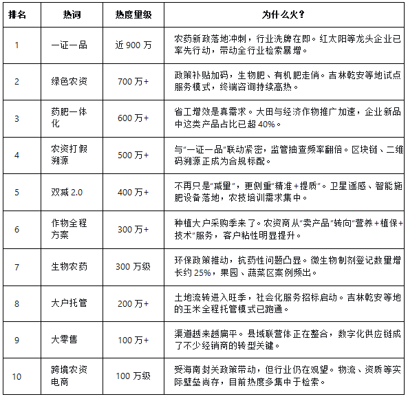 如今的农资行业,早就不再是价格战的战场。能否抓住趋势、读懂政策、洞察需求,或许才是未来竞争的关键。这份热度榜,既像行业的“晴雨表”,也希望能成为你年末冲刺、明年规划的“导航图”。