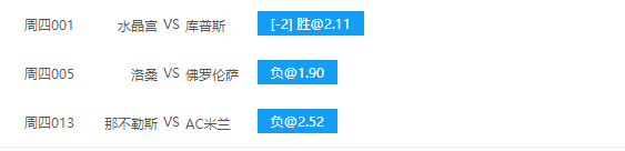 今日三场比赛分享到这里就结束了,对本期比赛的目标十分明确,三场比赛前两场碾压局没什么可评价,明天AC米兰可以赢下比赛那么基本上三场都能顺利过关,我们下期见!
